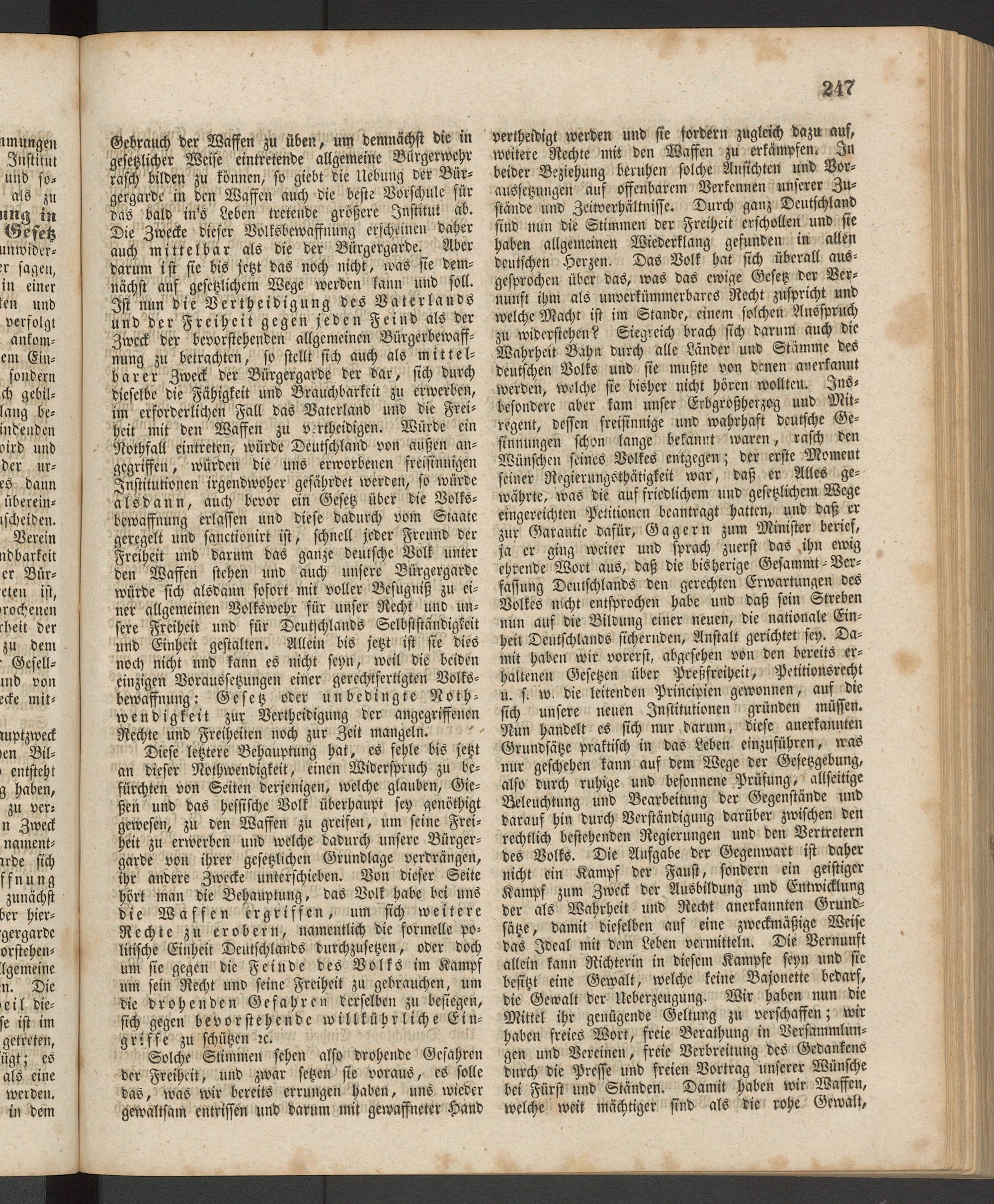 Diese letztere Behauptung hat, es fehle bis jetzt an dieser Nothwendigkeit, einen Widersprach zu befürchten von Seiten derjenigen, welche glauben, Gießen und das hessische Volk überhaupt ftp genöthigt gewesen, zu den Waffen zu greifet,, um seine Freiheit zu erwerben und welche dadurch unsere Bürgergarde von ihrer gesetzlichen Grundlage verdrängen, ihr andere Zwecke unterschieben. Von dieser Seite hört man die Behauptung, das Volk habe bei uns die Waffen ergriffen, tun sich weitere Rechte zu erobern, namentlich die formelle politische Einheit Deutschlands durchzusetzen, oder doch um sie gegen die Feinde des Volks im Kampf um fein' Recht und seine Freiheit zu gebrauchen, um die drohenden Gefahren derselben zu besiegen, sich gegen bevorstehende willkührliche Eingriffe zu schützen tc.