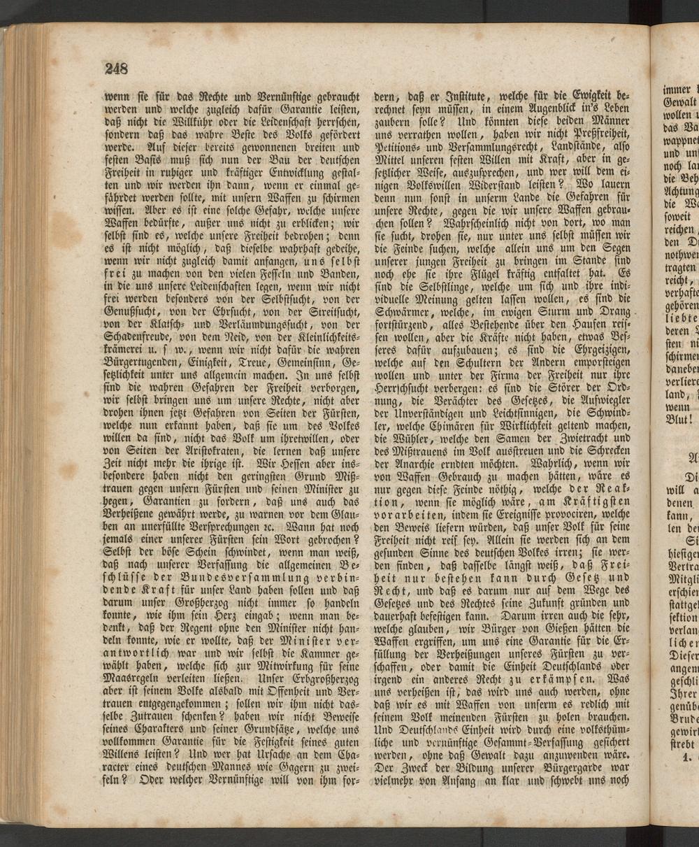 wenn sie für das Rechte und Vernünftige gebraucht werden und welche zugleich dafür Garantie leisten, daß nicht die Willknhr oder die Leidenschaft herrschen, sondern daß das wahre Beste des Volks gefördert werde. Auf dieser bereits gewonnenen breiten und festen Basis muß sich nun der Bau der deutschen Freiheit in ruhiger und kräftiger Entwicklung gestalten und wir werden ihn dann, wenn er einmal gefährdet werden sollte, mit unfern Waffen zu schirmen wissen. Aber eS ist eine solche Gefahr, welche unsere Waffen bedürfte, außer uns nicht zu erblicken; wir selbst sind es, welche unsere Freiheit bedrohen; denn es ist nicht möglich, daß dieselbe wahrhaft gedeihe, wenn wir nicht zugleich damit anfangen, uns selbst frei zu machen von den vielen Fesseln und Banden, in die uns unsere Leidenschaften legen, wenn wir nicht frei werden besonders von der Selbstsucht, von der Genußsucht, von der Ehrsucht, von der Streitsucht, von der Klatsch- und Verläumdungssucht, von der Schadenfreude, von dem Neid, von der Kleinlichkeits- krämerei u. s w., wenn wir nicht dafür die wahren Burgertugenden, Einigkeit, Treue, Geineinsinn, Gesetzlichkeit unter uns allgemein machen. In uns selbst sind die wahren Gefahren der Freiheit verborgen, wir selbst bringen uns um unsere Rechte, nicht aber drohen ihnen setzt Gefahren von Seiten der Fürsten, welche nun erkannt haben, daß sie um des Volkes willen da sind, nicht das Volk um ihretwillen, oder von Seiten der Aristokraten, die lernen daß unsere Zeit nicht mehr die ihrige ist. Wir Hessen aber insbesondere haben nicht den geringsten Grund Mißtrauen gegen unfern Fürsten und seinen Minister zu hegen, Garantien zu fordern, daß uns auch das Verheißene gewährt werde, zu warnen vor dem Glauben an unerfüllte Versprechungen rc. Wann hat noch jemals einer unserer Fürsten sein Wort gebrochen? Selbst der böse Schein schwindet, wenn man weiß, daß nach unserer Verfassung die allgeineincn Beschlüsse der Bundesversammlung verbindende Kraft für unser Land haben sollen und daß darum unser Großherzog nicht immer so handeln konnte, wie ihm sein Herz eingab; wenn man bedenkt, daß der Regent ohne den Minister nicht handeln konnte, wie er wollte, daß der Minister verantwortlich war und wir selbst die Kammer gewählt haben, welche sich zur Mitwirkung für seine Maaöregeln verleiten ließen. Unser Erbgroßherzog aber ist seinem Volke alsbald mit Offenheit und Vertrauen entgegengekommen; sollen wir ihm nicht dasselbe Zutrauen schenken? haben wir nicht Beweise seines Charakters und seiner Grundsätze, welche uns vollkommen Garantie für die Festigkeit seines guten Willens leisten? Und wer hat Ursache an demCha- racter eines deutschen Mannes wie Gageru zu zweifeln? Oder welcher Vernünftige will von ihm for