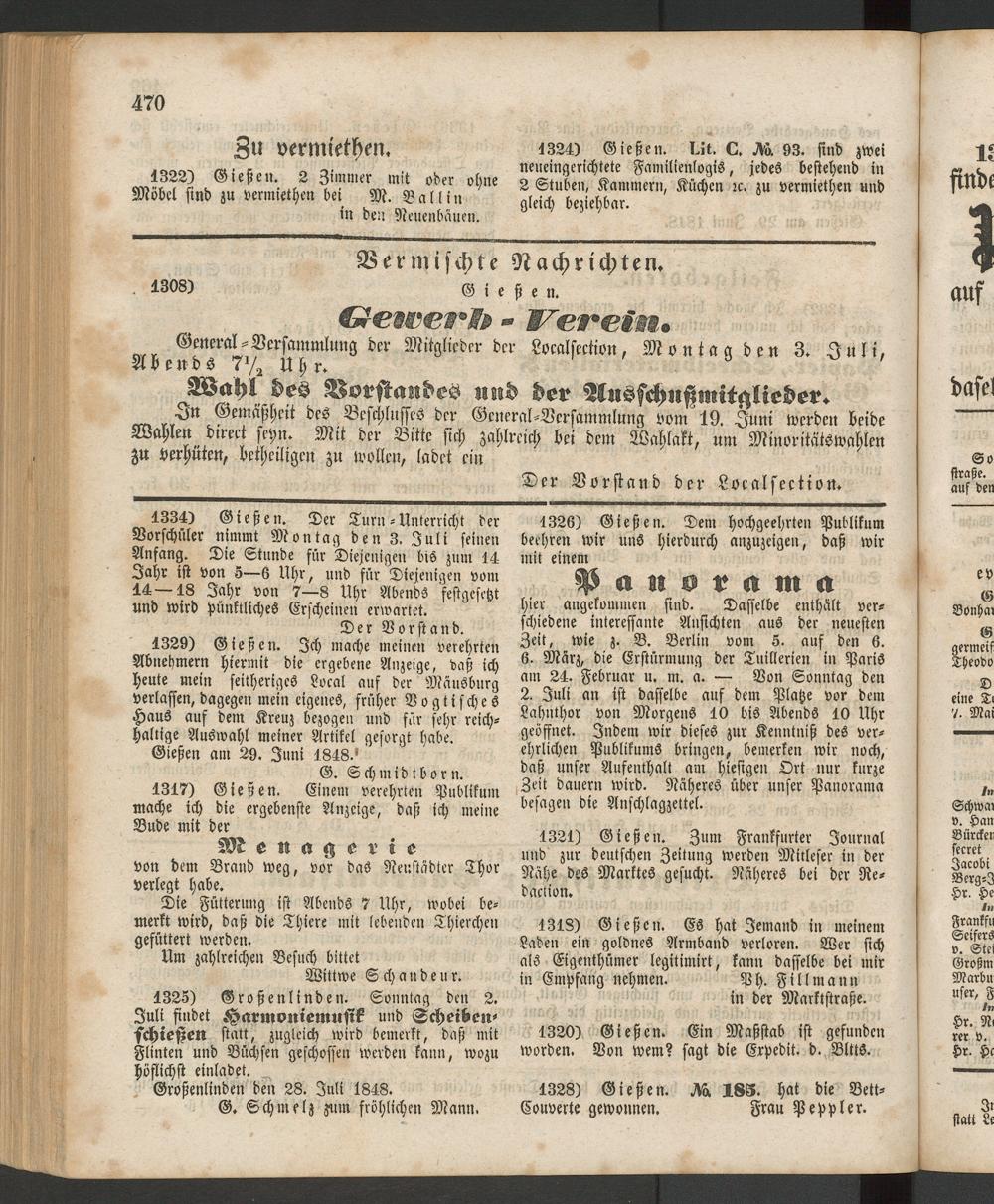 1325) Großenlinden. Sonntag den 2. Juli findet Harmoniemusik und Scheibenschießen statt, zugleich wird bemerkt, daß mit Flinten und Büchsen geschossen werden kann, wozu höflichst einladet.