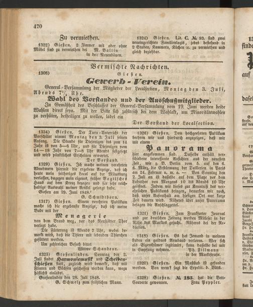 1334) Gießen. Der Turn - Unterricht der Borschüler nimmt Montag den 3. Juli seinen Anfang. Die Stunde für Diejenigen bis zum 14 Jahr ist von 5—6 Uhr, und für Diejenigen vom 44—48 Jahr von 7—8 Uhr Abends festgesetzt und wird pünktliches Erscheinen erwartet.