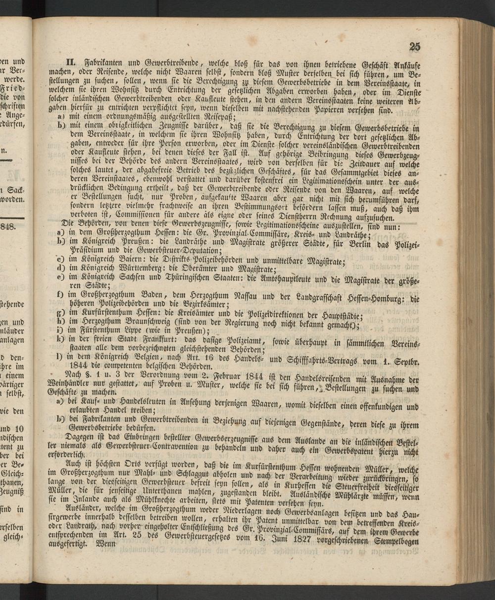 II. Fabrikanten und Gewerbtreibende, welche bloß für das von ibnen betriebene Geschäft Ankäufe machen, oder Reisende, welche nicht Maaren selbst, sondern bloß Muster derselben bei sich führen, um Bestellungen zu suchen, sollen, wenn ste die Berechtigung diesem Gewerbsbetriebe in dem Vereinsstaate, in welchem sie ihren Wohnsitz durch Entrichtung der gesetzlichen Abgaben erworben haben, oder im Dienste solcher inländischen Gewerbtreibenden oder Kaufleute stehen, in den andern Vereinsstaaten keine weiteren Abgaben hierfür zu entrichten verpflichtet seyn, wenn dieselben mit nachstehenden Papieren versehen sind.