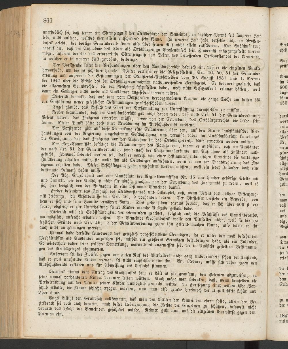 kmi AY Die Erläuterungen des Vorsitzenden , indem er ausführt, daß ein Ausländer f ?,rt. 51, fr Gemeindeordnung sowie nach ber Verfassungsurkunde um Aufnahme als Inländer nachgesucht, jedesmal bedeutet worden sei daß er vorerst von einer bestimmten inländischen Gemeinde die vorläufige Zusicherung erhalten muffe, sie wolle ihn als Ortsbürger aufnehmen, wenn er von der Staatsregierung das Jn- diguat erhalten habe Dieser Geschäftsgang habe eingehalten werden müssen, weil ein feder Inländer doch eine bestimmte Heimath, haben müsse. 1 1