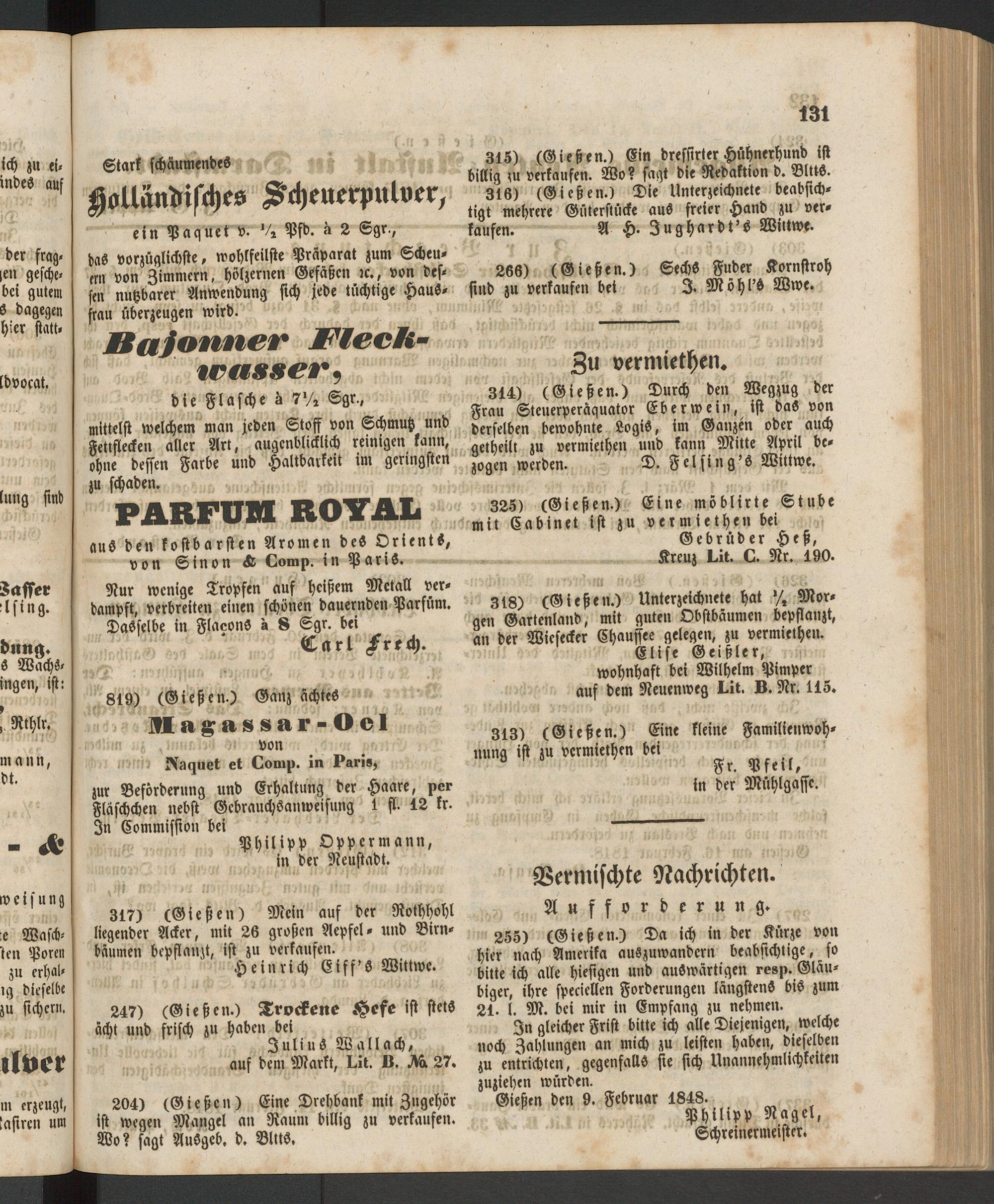 255) (Gießen.) Da ich in der Kürze von hier nach Amerika auszuwandcrn beabsichtige, so bitte ich alle hiesigen und auswärtigen resp. Gläubiger, ihre speciellen Forderungen längstens bis zum 21. l. M. bei mir in Empfang zu nehmen.