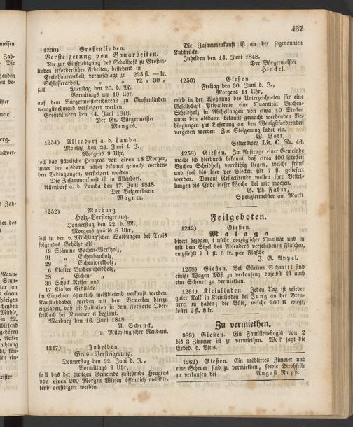 1258) Gießen. Im Auftrage einer Gemeinde mache ich hierdurch bekannt, daß circa 400 Stecken Buchen Scheidholz vorräthig liegen, welche frank und frei bis hier per Stecken für 7 st. geliefert werden. Darauf Reflectirende wollen ihre Bestellungen bis Ende dieser Woche bei mir machen.