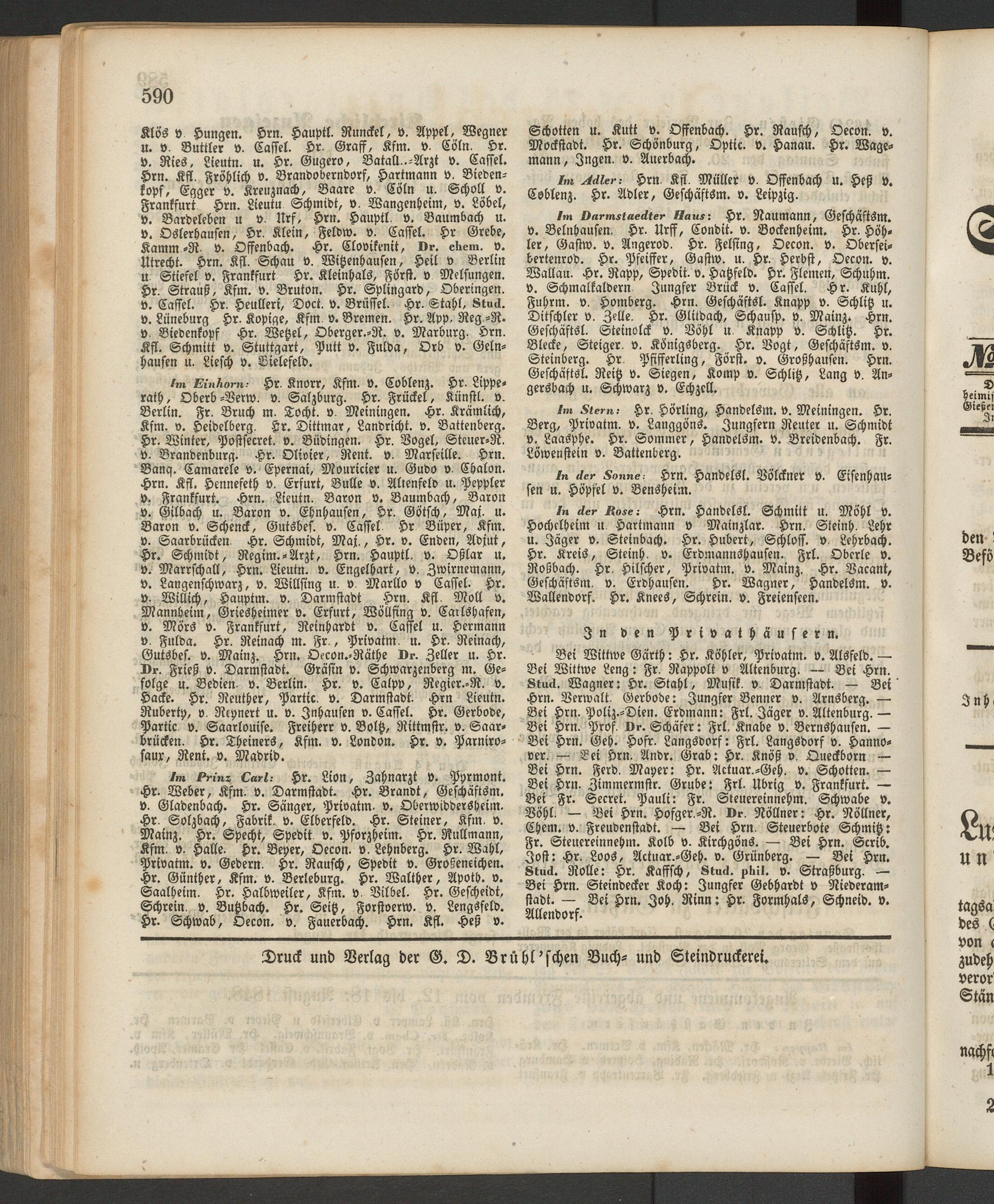 Bei Wittwe Gärth: Hr. Köhler, Privatm. v. Alsfeld. — Bei Wittwe Leng: Fr. Rappolt v Altenburg. — Bei Hrn. Stud. Wagner: Hr. Stahl, Musik, v. Darmstadt. — Bei Hrn. Verwalt. Gerbode: Jungfer Benner v. Arnsberg. — Bei Hrn. Poliz.-Dien. Erdmann: Frl. Jäger v. Altenburg. — Bei Hrn. Prof. Dr. Schäfer: Frl. Knabe v. Bernshausen. — Bei Hrn. Geh. Hofr. Langsdorf: Frl. Langsdorf v. Hannover. — Bei Hrn. Andr. Grab: Hr. Knöß v. Queckborn — Bei Hrn. Ferd. Mayer: Hr. Actuar.-Geh. v. Schotten. — Bei Hrn. Zimmermstr. Grube: Frl. Übrig v. Frankfurt. — Bei Fr. Secret. Pauli: Fr. Steuereinnehm. Schwabe v. Böhl. — Bei Hrn. Hofger.-R. Dr. Röllner: Hr. Nöllner, Chem. v. Freudenstadt. — Bei Hrn. Steuerbote Schmitz: Fr. Steuereinnehm. Kolb v. Kirchgöns. — Bei Hrn. Scrib. Jost: Hr. Loos, Actuar.-Geh. v. Grünberg. — Bei Hrn. Stud. Rolle: Hr. Kaffsch, Stud. phil. v. Straßburg. — Bei Hrn. Steindecker Koch: Jungfer Gebhardt v Niederam- stadt. — Bei Hrn. Joh. Rinn: Hr. Formhals, Schneid, v. Allendorf.