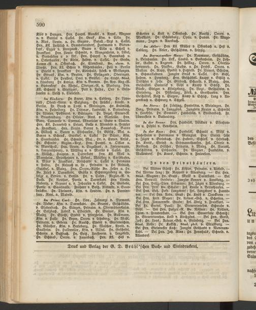 Im Darmstaedter Haus: Hr. NaUMÜNN, Geschästsm. v. Beinhausen. Hr. Urff, Condit. v. Bockenheim. Hr. Köhler, Gastw. v. Angerod. Hr. Felsing, Oecon. v. Oberseibertenrod. Hr. Pfeiffer, Gastw. u. Hr. Herbst, Oecon. v. Wallau. Hr. Rapp, Spedit. v. Hatzfeld. Hr. Flemen, Schuhm. v. Schmalkaldern Jungfer Brück v. Cassel. Hr. Kuhl, Fuhrm. v. Homberg. Hrn. Geschäftsl. Knapp v. Schlitz u. Ditschler v. Zelle. Hr. Glitdach, Schausp. v. Mainz. Hrn. Geschäftsl. Steinolck v. Vöhl u. Knapp v. Schlitz. Hr. Blecke, Steiger, v. Königsberg. Hr. Vogt, Geschästsm. v. Steinberg. Hr. Pfifferling, Först, o. Großhausen. Hrn. Geschäfts!. Reitz v. Siegen, Komp v. Schlitz, Lang v. Angersbach u. Schwarz v. Echzcll.