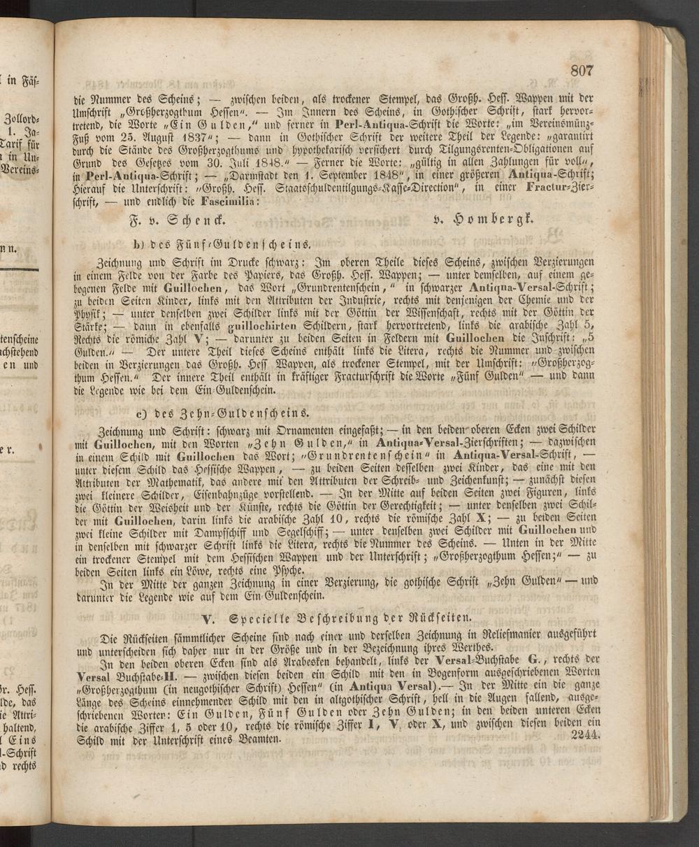 die Nummer des Scheins; — zwischen beiden, als trockener Stempel, das Großh. Hess. Wappen mit der Umschrift „Großherzogtbum Hessen". — Im Innern des Scheins, in Gothischer Schrift, stark hervortretend, die Worte »Ein Gulden," und ferner in Perl-Vntiqua-Schrift die Worte: „im Vereinsmünz- Fuß vom 25. August 1837"; — dann in Gothischer Schrift der weitere Theil der Legende: »garantirt durch die Stände des Großherzogthums und hypothekarisch versichert durch Tilgungsrenten-Obligationen auf Grund des Gesetzes vom 30. Juli.1848." — Ferner die Worte: „gültig in allen Zahlungen für voll", in kcrl-Antiqua-Schrift; — „Darmstadt den 1. September 1848", in einer größeren Antiqua-Schrift; Hierauf die Unterschrift: »Großh. Hess. Staatsschuldentilgungs-Kaffe-Direction", in einer Fruciur-Zier- schrift, ■— und endlich die Faschnilia: