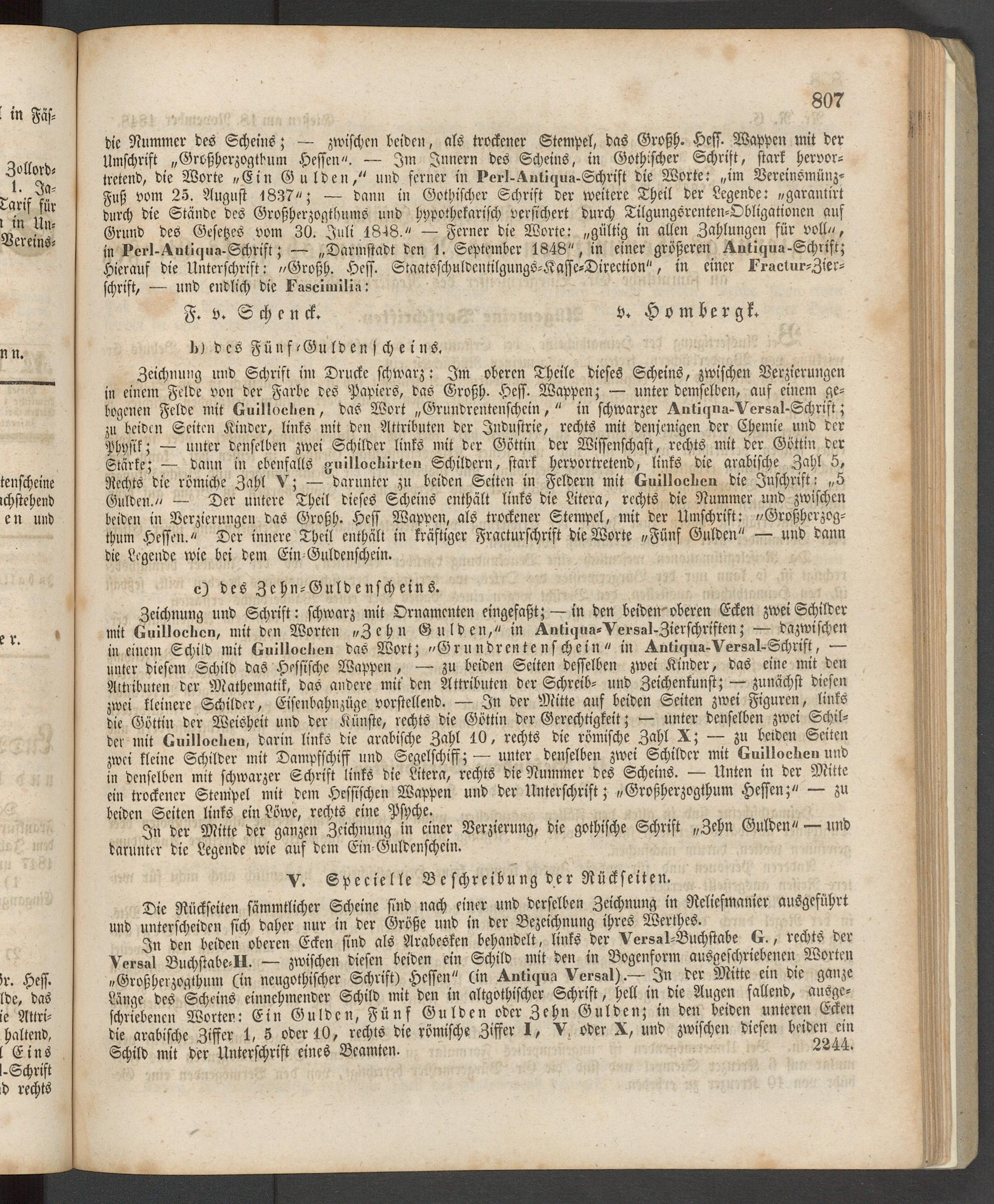 In den beiden oberen Ecken sind als Arabesken behandelt, links der Versa 1-Buchstabe G., rechts rer Versal Buchstabe-». — zwischen diesen beiden ein Schild mit den in Bogenform ausgeschriebenen Worten »Großherzogchum (in ncugothischer Schrift) Hessen" (in Antiqua Versal).— 3ti ter Mitte em die ganze Länge des Scheins einnehmender Schild mit den in altgothischer Schrift, hell tn die Augen fallend, aiisge- schriebencn Worten: Ein Gulden, Fünf Gulden oder Zehn Gulden; in den beiden unteren Ecken die arabische Ziffer 1, 5 oder 10, rechts die römische Ziffer I, V, oder X, und zwischen diesen beiden em Schild mit der Unterschrift eines Beamten. 2241.
