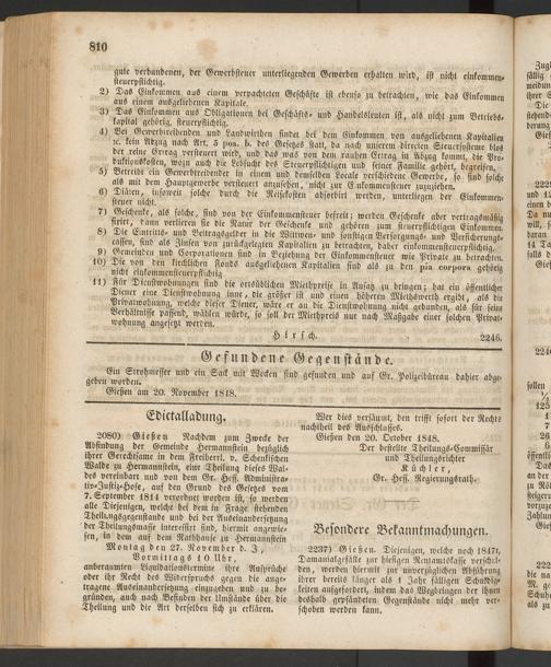 2080) Gießen Nachdem zum Zwecke der Abfindung der Gemeinde Hermannstein bezüglich ihrer Gerechtsame in dem Freiherr!, v. Schenkischen Walde zu Hermannstein, eine Theilung dieses Waldes vereinbart und von dem Gr. Hess Administra- tiv-Justiz-Hofe, auf den Grund des Gesetzes vom 7. September 1814 verordnet worden ist, so werden alle Diejenigen, welche bei dem in Frage stehenden Theill.ngsgegenstande und bei der Auseinandersetzung der Theilungsmasse interessirt sind, hiermit angewiesen, in dem auf dem Rathhause zu Hermannstein