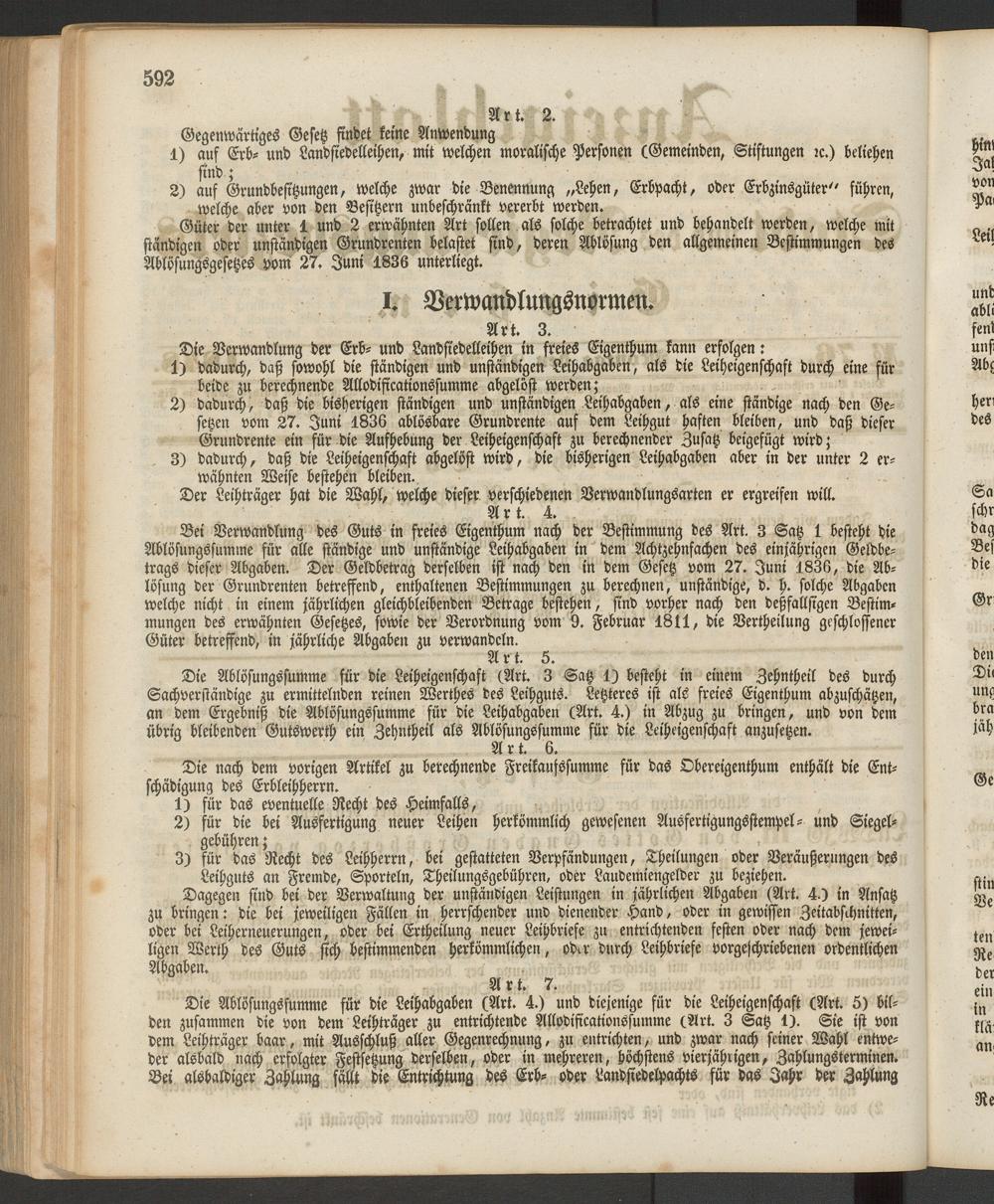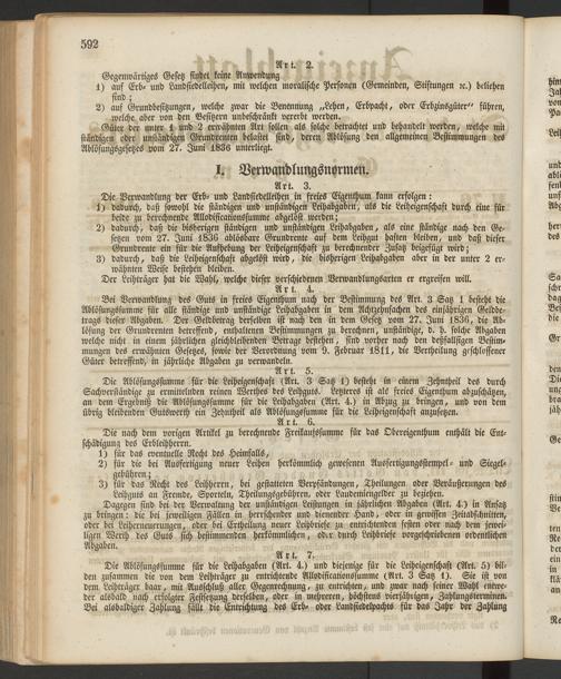 Bei Verwandlung des Guts in freies Eigenthum nach der Bestimmung des Art. 3 Satz 1 besteht die Ablösungssumine für alle ständige und unständige Leihabgaben in dem Achtzehnfachen des einjährigen Geldbetrags dieser Abgaben. Der Geldbetrag derselben ist nach den in dem Gesetz vom 27. Juni 1836, die Ablösung der Grundrenten betreffend, enthaltenen Bestimmungen zu berechnen, unständige, d. h. solche Abgaben welche nicht in einem jährlichen gleichbleibenden Betrage bestehen, sind vorher nach den dcßfallsigen Bestimmungen des erwähnten Gesetzes, sowie der Verordnung vom 9. Februar 1811, die Vertheilung geschlossener Güter betreffend, in jährliche Abgaben zu verwandeln.