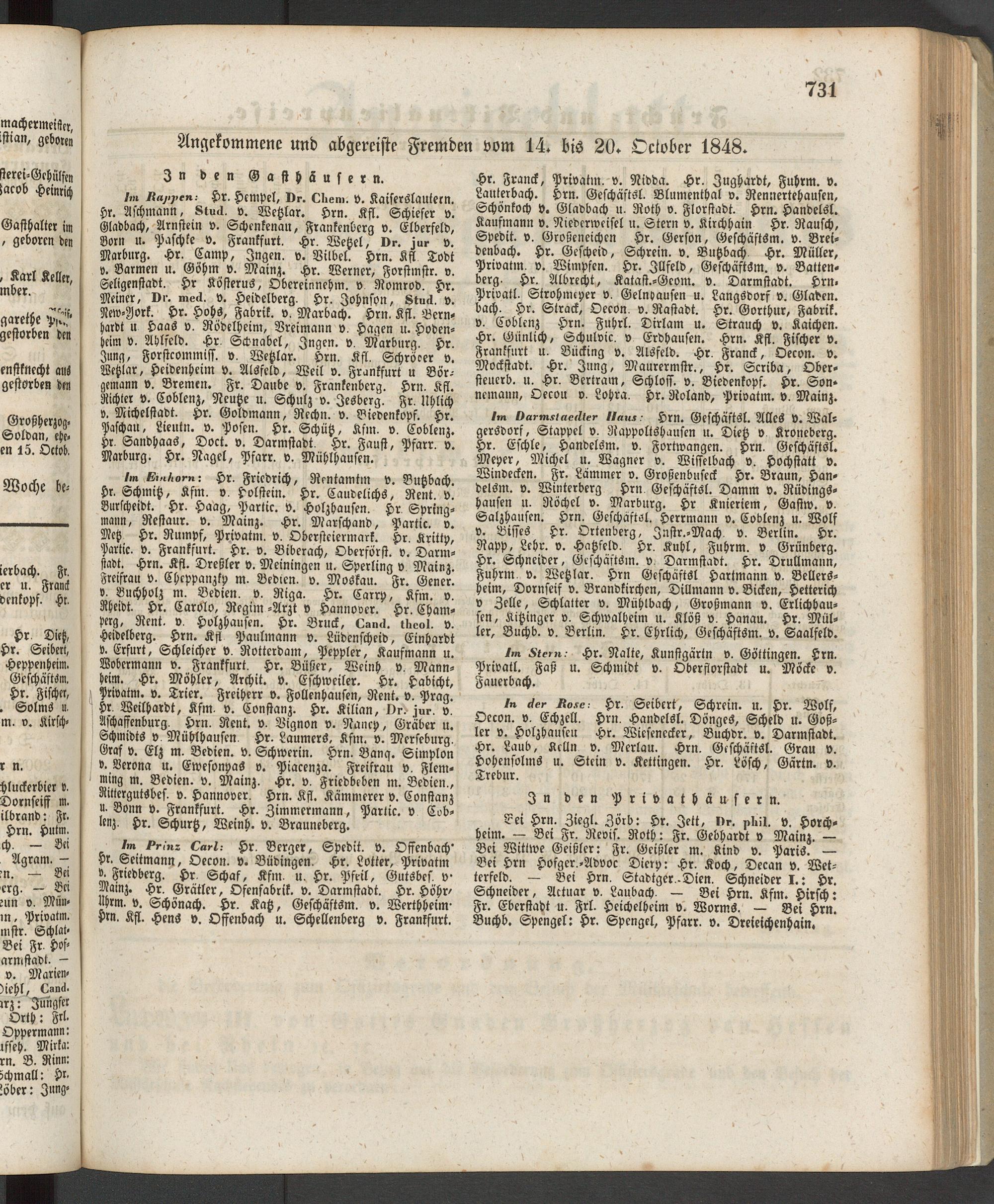 Im Rapyen: Hr. Hempel, Dr. Cliem. v. Kaiserslautern, hr. Aschmann, Stud. v. Wetzlar. Hrn. Kfl. Schiefer v. Gladbach, Arnstein v. Schenkenau, Frankenberg v. Elberfeld, Born u. Paschke v. Frankfurt. Hr. Wetzel, Dr. jur v. Marburg. Hr. Camp, Ingen, v. Vitbel. Hrn. Kfl Todt v. Barmen u. Göhm v. Mainz. Hr. Werner, Forstmstr. v. Seligenstadt. Hr Kösterus, Obereinnehm. v. Romrod. Hr. Meiner, Dr. med. v. Heidelberg. Hr. Johnson, Stud. v. New-Jork. Hr. Hohs, Fabrik, v. Marbach. Hrn. Kfl. Bernhardt u. Haas v. Rödelheim, Breimann v. Hagen u. Hodenheim v. Ahlfeld. Hr. Scdnabel, Ingen, v. Marburg. Hr. Jung, Forstcommiff. v. Wetzlar. Hrn. Kfl. Schröcer v. Wetzlar, Heidenheim v. Alsfeld, Weil v. Frankfurt u Bör- gemann v. Bremen. Fr. Daube v. Frankenberg. Hrn. Kfl. Richter v. Coblenz, Neutze u. Schulz v. Jesberg. Fr. llhlich v. Michelstadt. Hr. Goldmann, Rechn, v. Biedenkopf. Hr. Paschau, Lieutn. v. Posen. Hr. Schütz, Kfm. v. Coblenz. Hr. SandhaaS, Doct. v. Darmstadt. Hr. Faust, Pfarr. v. Marburg. Hr. Nagel, Pfarr. v. Mühlhausen.