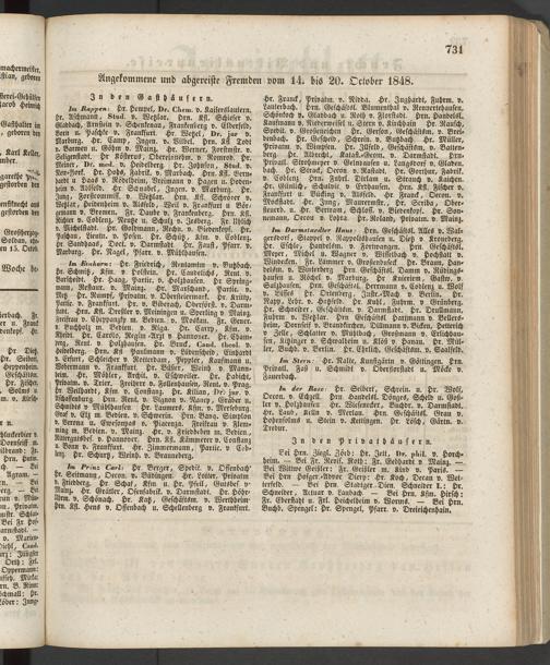 Bei Hrn. Ziegl. Zörb: Hr. Jett, Dr. phil. v. Horch- heim. — Bei Fr. Revis. Roth: Fr. Gebhardt v Mainz. — Bei Wittwe Geißler: Fr. Geißler m. Kind v. Paris. — Bei Hrn Hofgcr.-Advoc Dicrp: Hr. Koch, Decan v. Wetterfeld. — Bei Hrn. Stadtger.-Dien. Schneider I.: Hr. Schneider, Actuar v. Laubach. — Bei Hrn. Kfm. Hirsch: Fr. Eberstadt u. Frl. Heichelheim v. Worms. — Bei Hrn. Buchb. Speugel: Hr. Speugel, Pfarr. v. Dreieichenhain,