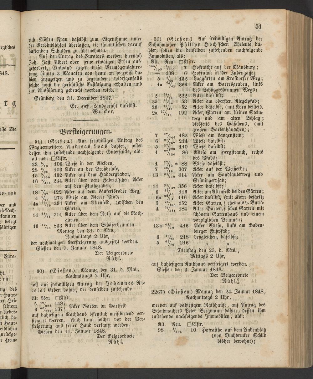 der nochmaligen Versteigerung ausgesetzt werden. Gießen den 7. Januar 1848.