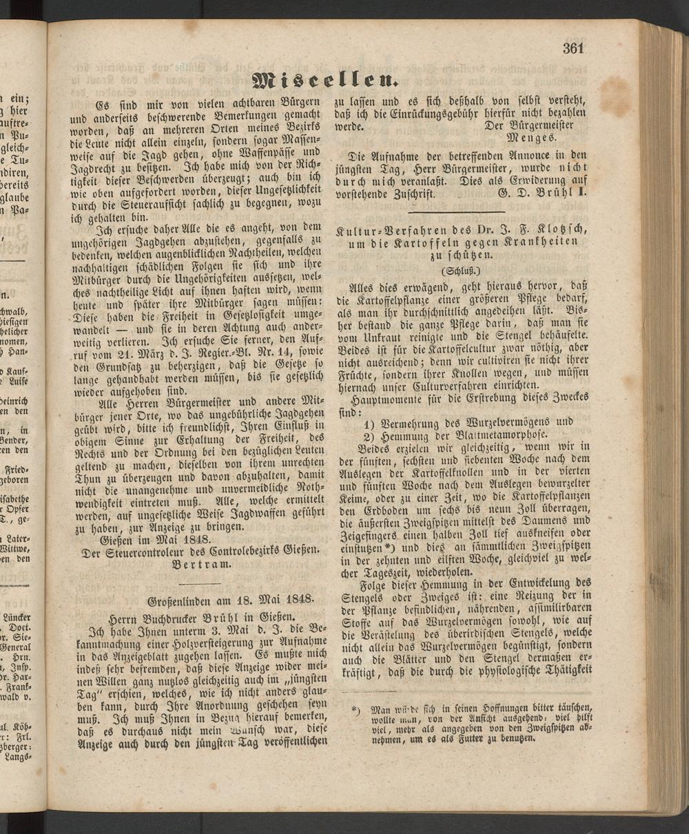 Kultur-Verfahren des Dr. I. F. Klotzlch, um die Kartoffeln gegen Krankheiten zu schützen.