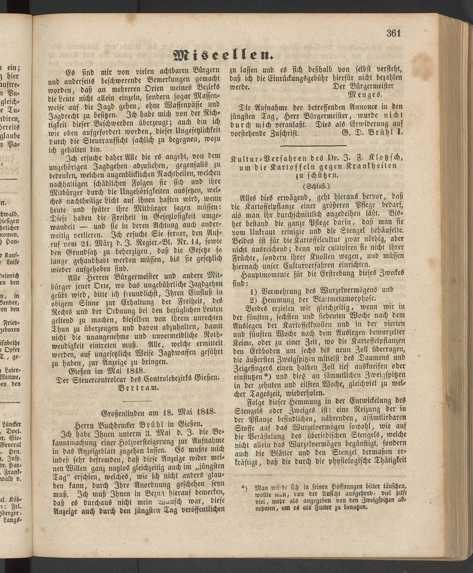 Der Steuereontroleur des Controlebezirks Gießen. Bertram.