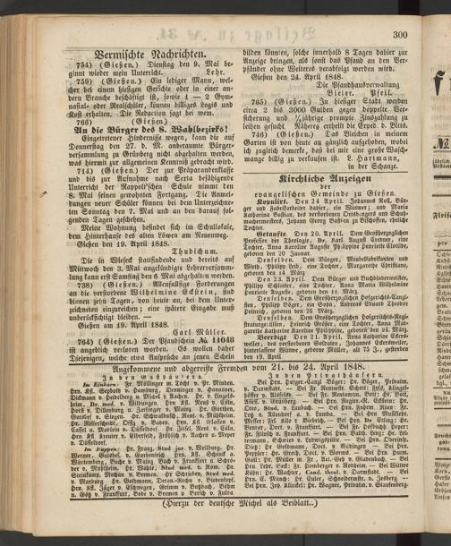Kirchliche Anzeigen der evangelischen Gemeinde zu Gießen. Kopulirt. Den 2 4 April. Johannes Noll, Bürger und Fabrikarbeiter dahier, ein Wittwer; und Maria Katharina Bastian, des verstorbenen OrtsburgerS und Schuh- machermelsters, Johann Georg Bastian zu Bischoffen, eheliche Tochter.