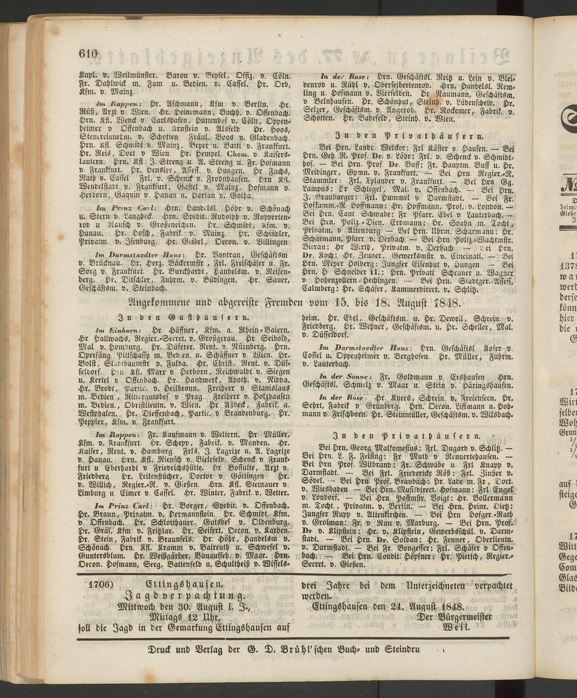 Im Prinz Carl: Hr. Borger, Spedii. v. Offenbach. Hr. Braun, Privatm. v. Hermannstein. Hr. Schmidt, Kfm. v Offenbach. Hr. Scklotthauer. Gutsbes v. Oldenburg. Hr. Gräs, Kfm. v. Fritzlar. Hr. Seifert, Oecon. v. Karben. Hr. Stein, Fabrik, v. Braunfels. Hr. Höhr, Handelsm. v. Schönach. Hrn. Kfl. Kramm v. Baireuth u. Schwefel v. Guntersblum. Hr. Weißgarber, Bauaufsch. v. Maar. Hrn. Oecon. Hofmann, Seeg, Battenfeld u. Schultheiß v. Wissels