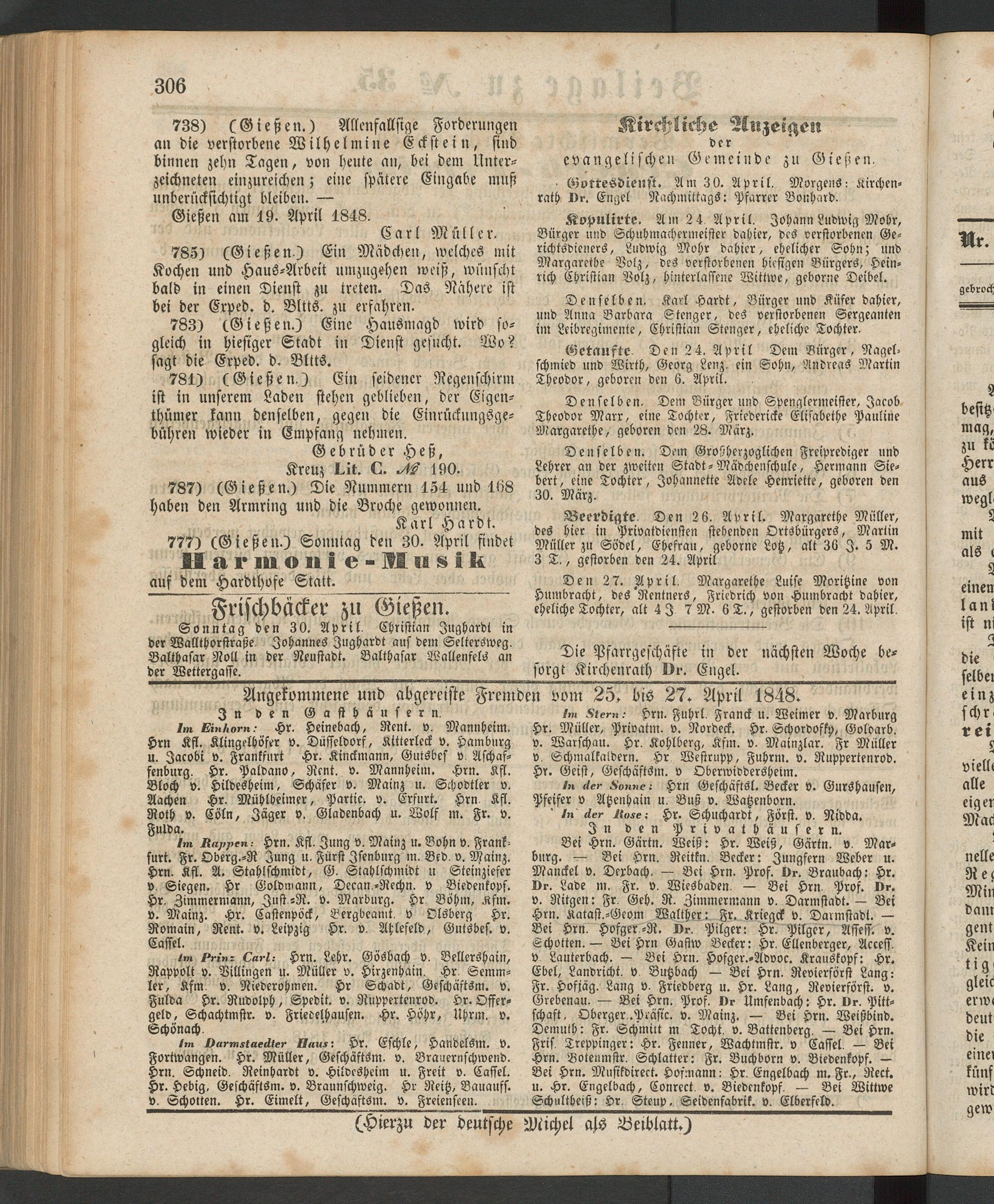 Im Rappen: Hrn. Kst. Jung v. Mainz u. Bohn v. Frankfurt. Fr. Oberg.-R Jung u. Fürst Isenburg m. Bed. v. Mainz. Hrn. Kfl. A. Stahlschmidt, G. Stahlschmidt u Steinziefer v. Siegen. Hr Eoldwann, Decan.-Rechn, v Biedenkopf. Hr. Zimmermann, Just -R. v. Marburg. Hr Böhm, Kfm. v. Mainz. Hr. Castenpöck, Bergbeamt. v Olsberg Hr. Romain, Reut. v. Leipzig Hr. v. Ahlefeld, Gutsbes. v. Cassel.