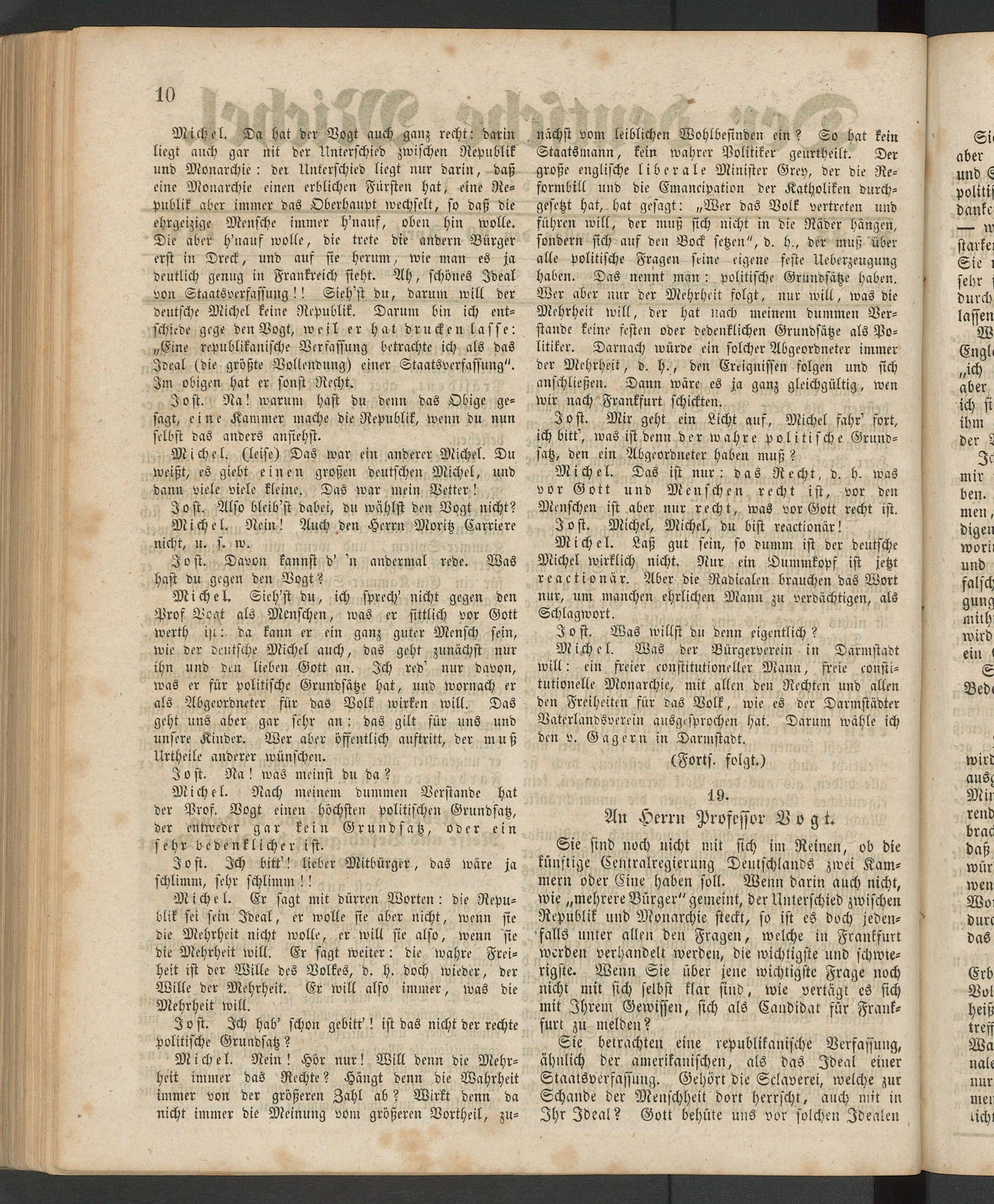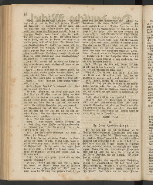 Michel. Da hat der Vogt auch ganz recht: darin liegt auch gar nit der Unterschied zwischen Republik und Monarchie: der Unterschied liegt nur darin, daß eine Monarchie einen erblichen Fürsten hat, eine Republik aber immer das Oberhaupt wechselt, so daß die ehrgeizige Mensche immer h'nauf, oben hin wolle. Die aber h'nauf wolle, die trete die andern Bürger erst in Dreck, und auf sie herum , wie man es ja deutlich genug in Frankreich sieht. Ah, schönes Ideal von Staatsverfassung!! Sieh'st du, darum will der deutsche Michel keine Republik. Darum bin ich entschiede gege den Vogt, weil er hat drucken lasse: „Eine republikanische Verfassung betrachte ich als das Jreal (die größte Vollendung) einer Staatsverfassung". Im obigen hat er sonst Recht.