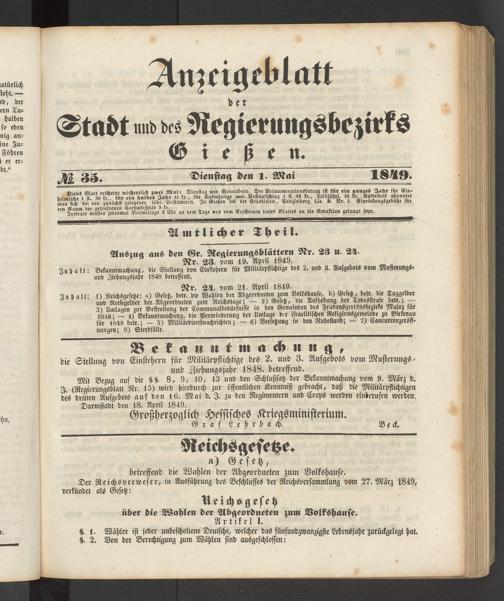Der Neichsverweser, in Ausführung des Beschlusses der Reichsversammlung vom 27. März 1849, verkündet als Gesetz: