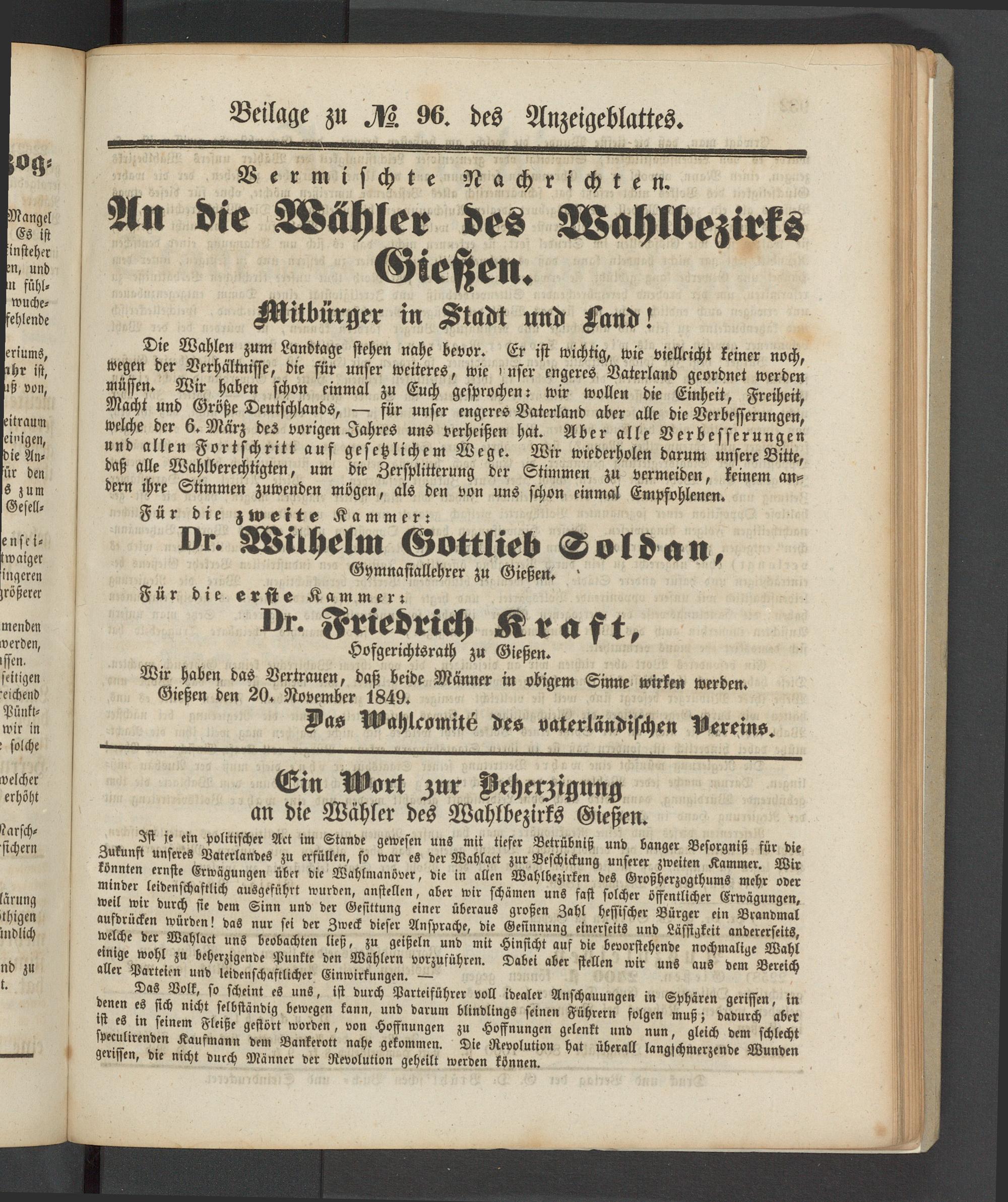 Wir haben das Vertrauen, daß beide Männer in obigem Sinne wirken werden. Greßen den 20. November 1849.