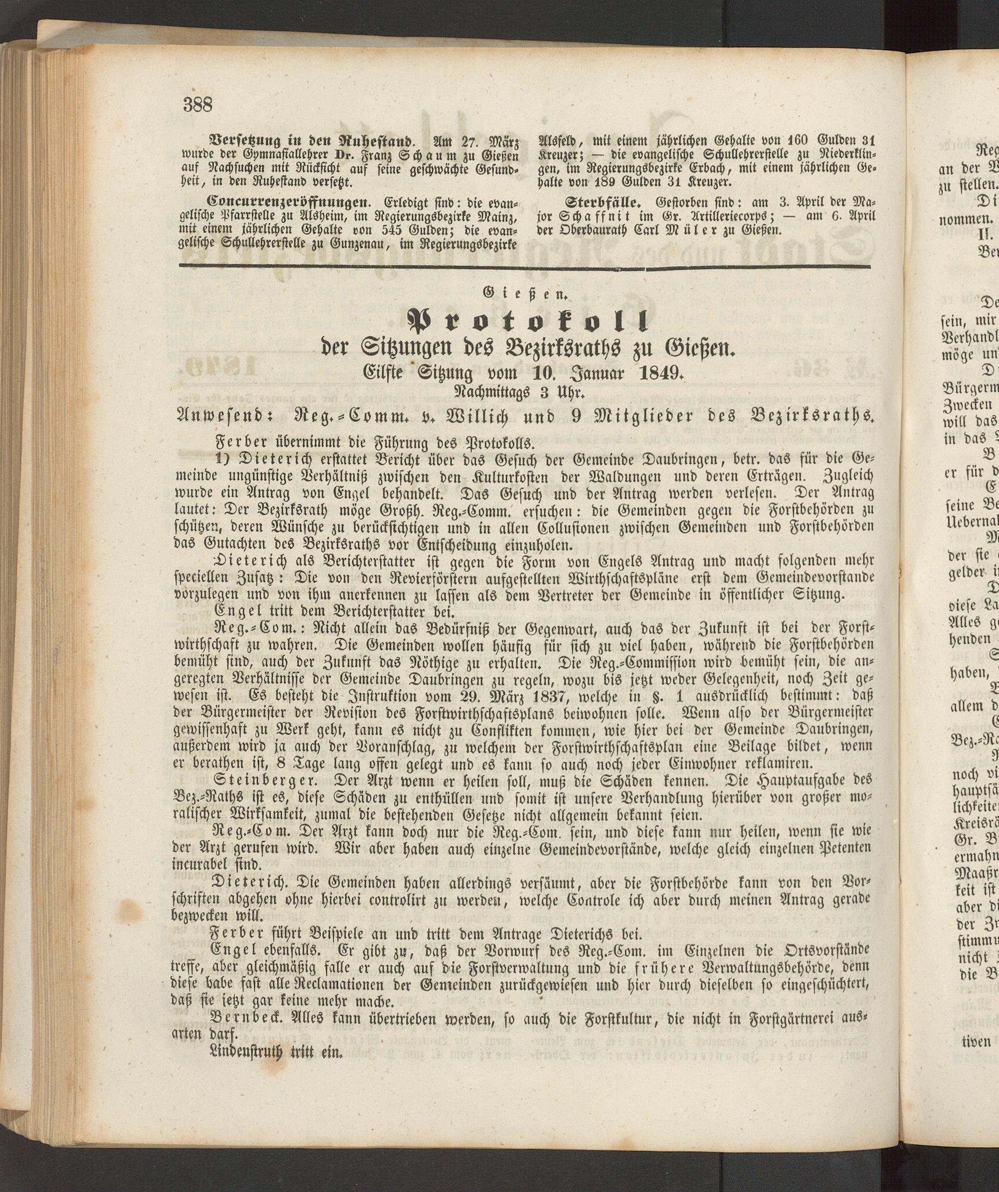 1) Dieterich erstattet Bericht über das Gesuch der Gemeinde Daubringen, betr. das für die Gemeinde ungünstige Verhältniß zwischen den Kulturkosten der Waldungen und deren Erträgen. Zugleich wurde ein Antrag von Engel behandelt. DaS Gesuch und der Antrag werden verlesen. Der Antrag lautet: Der Bezirksrath möge Großh. Reg.-Comm. ersuchen: die Gemeinden gegen die Forstbehörden zu schützen, deren Wünsche zu berücksichtigen und in allen Collusionen zwischen Gemeinden und Forstbehörden das Gutachten des Bezirksraths vor Entscheidung einzuholen.