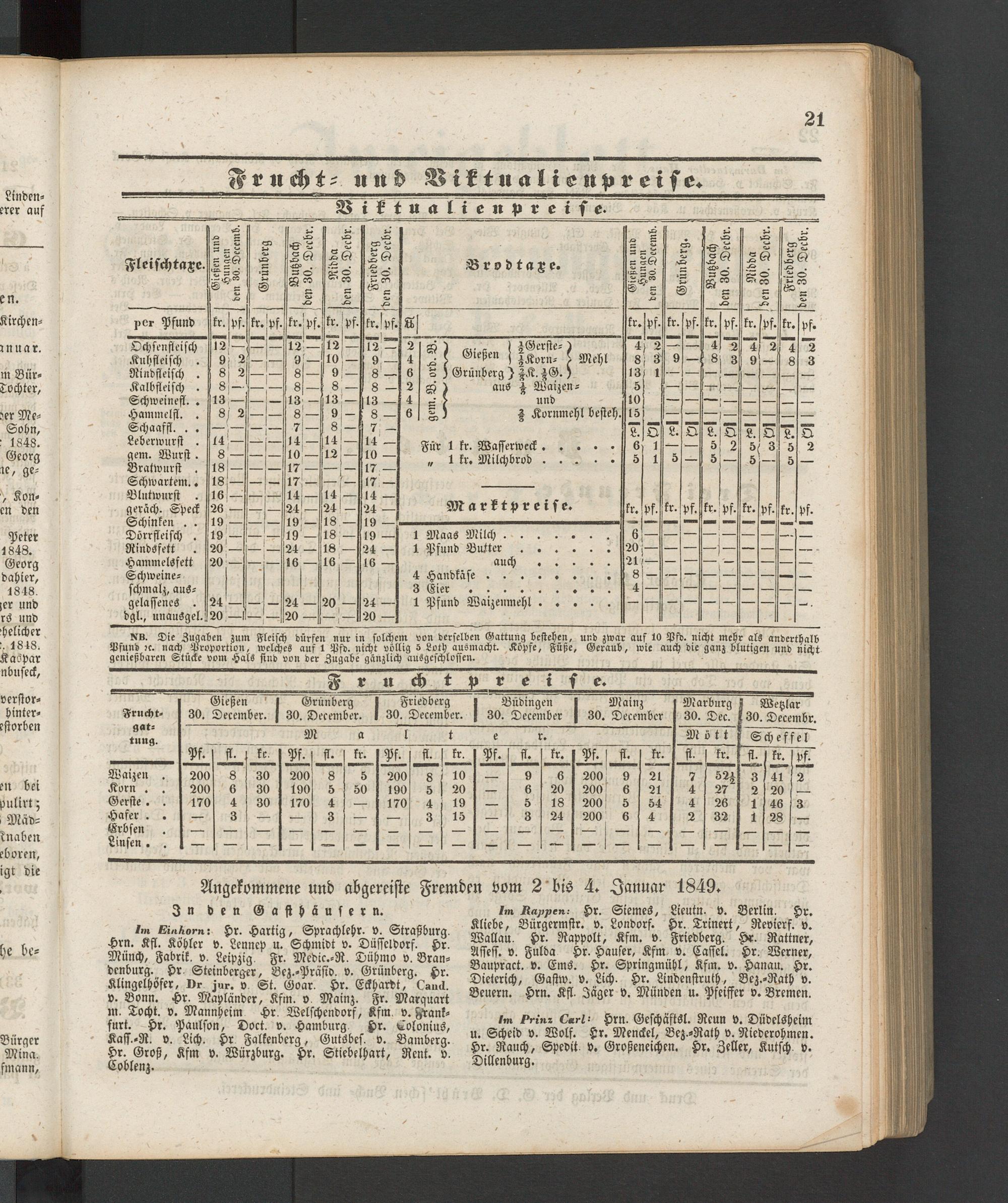 Angekommene und abgereiste Fremden vom 2 ’ bis 4» Zanuar 1849.