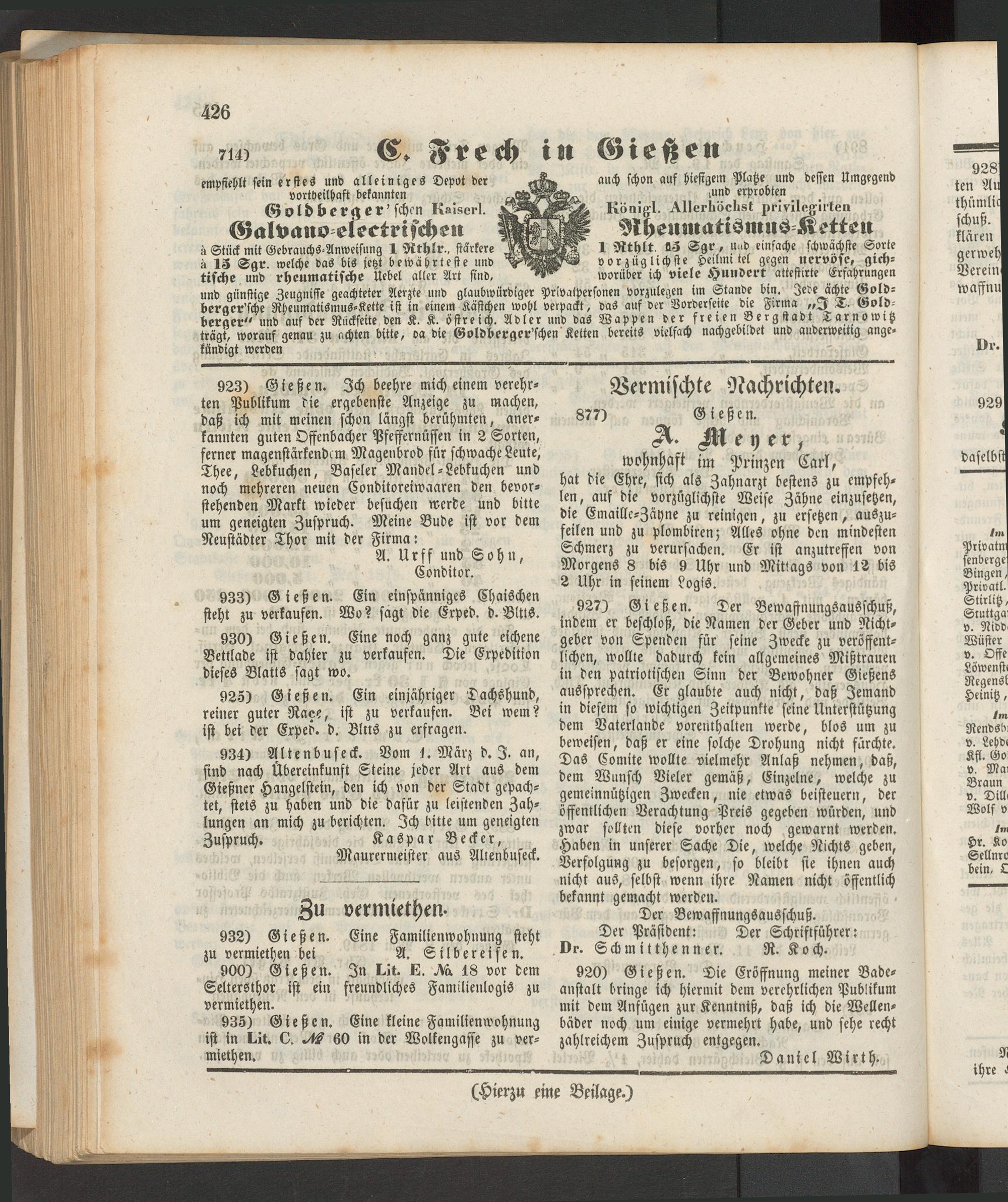 A. Meyer, wohnhaft jm Prinzen Carl, hat die Ehre, sich als Zahnarzt bestens zu empfehlen, auf die vorzüglichste Weise Zähne einzusetzen, die Emaillc-Zäyne zu reinigen, zu ersetzen, auszufeilen und zu plombiren; Alles ohne den mindesten Schmerz zu verursachen. Er ist anzutreffen von Morgens 8 bis 9 Uhr und Mittags von 12 bis 2 Uhr in seinem Logis.