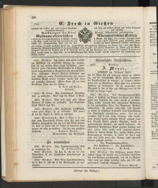 923) Gießen. Ich beehre mich einem verehrten Publikum die ergebenste Anzeige zu machen, daß ich mit meinen schon längst berühmten, anerkannten guten Offenbacher Pfeffernüssen in 2 Sorten, ferner magenstärkendem Mageubrod für schwache Leute, Thee, Lebkuchen, Baseler Mandel-Lebkuchen und noch mehreren neuen Conditoreiwaaren den bevorstehenden Markt wieder besuchen werde und bitte um geneigten Zuspruch. Meine Bude ist vor dem Neustädter Thor mit der Firma: