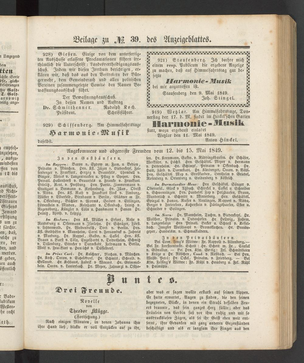 im Einhorn- Hrn Kfl. Müller v. Erfurt, Rohe v. Rendsburg u. Ostermann v. Zsarlohn. Hr. Schräger, Först, v. Lehdenwald. Hr. Weidenbusch, Doct. v. Berlin. Hrn. Kfl. Goldhöfer v. Mannheim, Carri v. Fernambuk u. Jahreis v. Marburg. Hr. Nuppel, Gastw. v. Cassel Hrn. Kfl. Braun u. Barst v. Cöln, Engelhardt v. Deidesheim, Schmitz v. Dillenburg, Strecker v Darmstadt, Feldmann v. Berlin, Wolf v. Frankfurt u. Henrichs v. Düsseldorf.