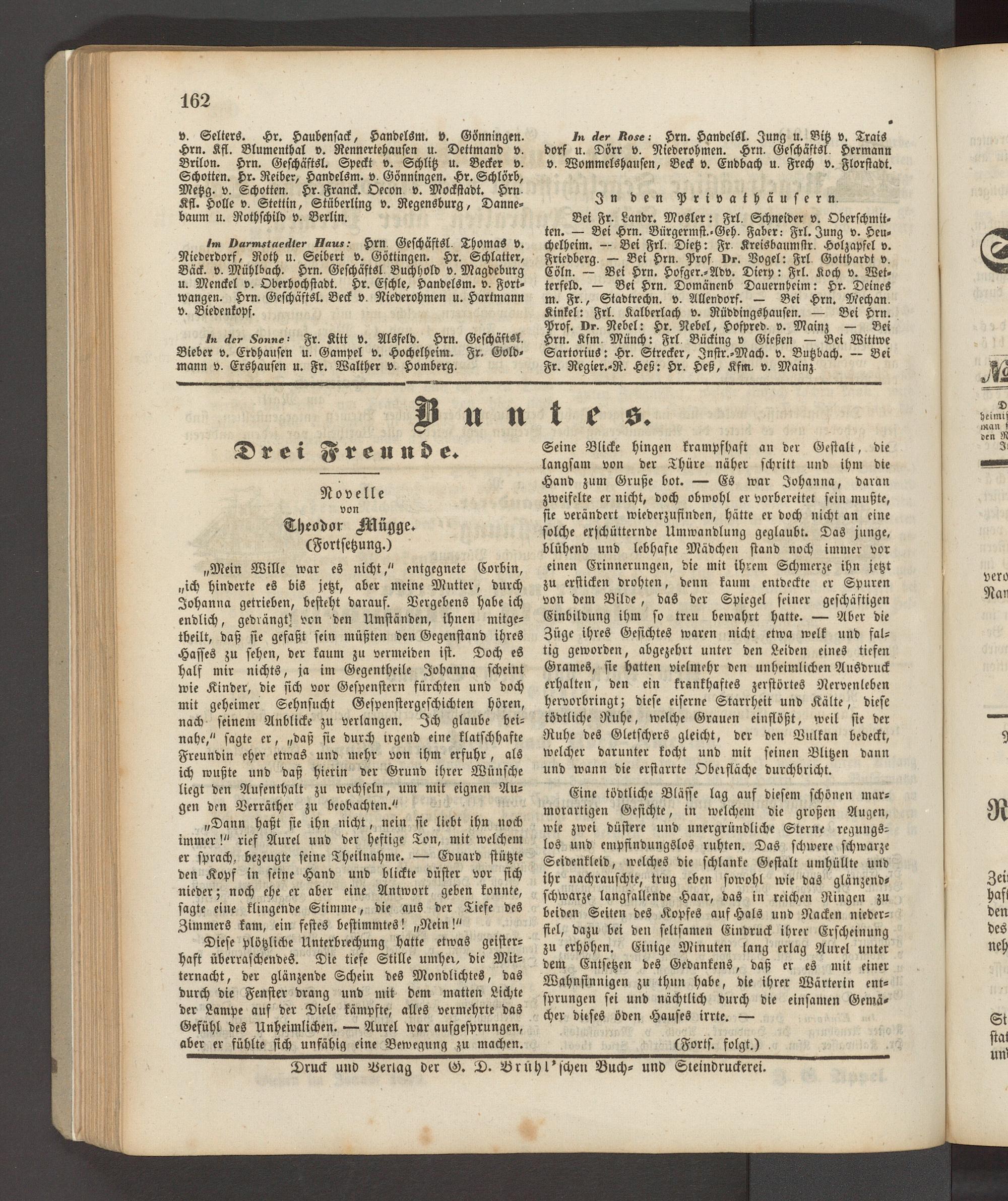 Im Darmstaedter Haus: HrN Geschästsl. Thomas V. Niederdorf, Roth u. Seibert v. Göttingen. Hr. Schlatter, Bäck. v. Mühlbach. Hrn. Geschäftsl. Buchhold v. Magdeburg u. Menckel v. Oberhochstadt. Hr. Eschle, Handelsm. v. Fort- Wangen. Hrn. Geschäftsl. Beck v. Niederohmen u. Hartmann v. Biedenkopf.