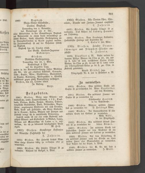 1975) Gießen. Eine möblirte Stube mit Sopha ist zu vermiethen bei Wwe. Tensfelder auf dem Neuenweg.