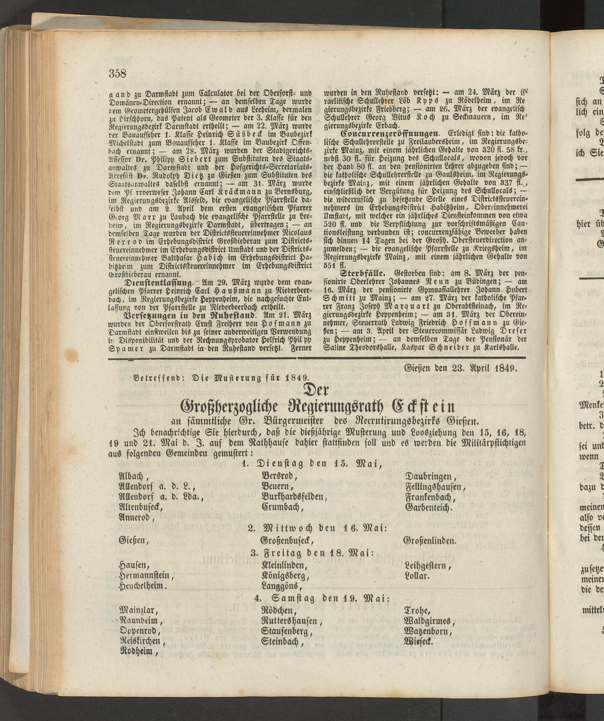 Ich benachrichtige Sie hierdurch, daß die dießjährige Musterung und Loosziehung den 15, 16, 18, 19 und 21. Mai d. I. auf dem Rathhause dahier stattfinden soll und es werden die Militärpflichtigen auS folgenden Gemeinden gemustert: