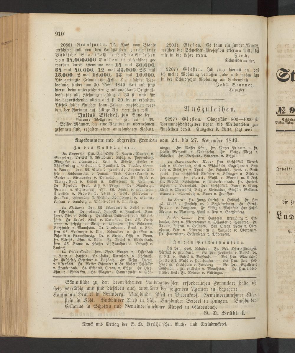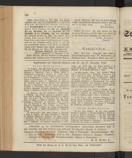2227) Gießen. Ohngefähr 800—1000 fl. Vormundschaftsgelder liegen bis Weihnachten zum Ausleihen bereit. Ausgeber d. BlitS. sagt wo?