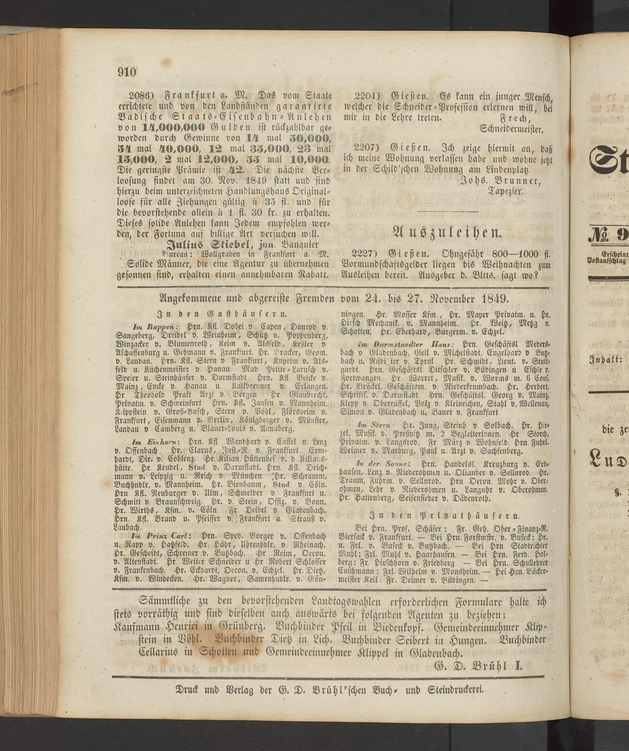 2086) Frankfurt a. M. Das vom Staate errichtete und von den Landständen garantirte Badische Staats-Eisenbahn- A n l e h e n von 14,000,000 Gulden ist rückzahlbar geworden durch Gewinne von 14 mal 30,000, 34 mal 40,000, 12 mal 33,000, 23 mal 13,000, 2 mal 12,000, 33 mal 10,000, Die geringste Prämie ist 42. Die nächste Ber- loosung findet am 30. Nov. 1849 statt und sind hierzu beim unterzeichneten Handlungshaus Original- loose für alle Ziehungen gültig ä 35 fl. und für die bevorstehende allein ä 1 fl. 30 fr. zu erhalten. Dieses solide Anlehen kann Jedem empfohlen werden, der Fortuna auf billige Art versuchen will.