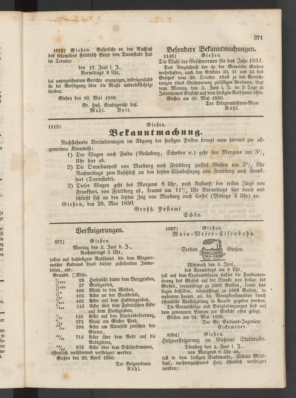2) Die Omnibuspost von Marburg nach Friedberg passirt Gießen um 37, Uhr Nachmittags zum Anschluß an den letzten Eisenbahnzug von Frredberg nach Frankfurt (Darmstadt). „