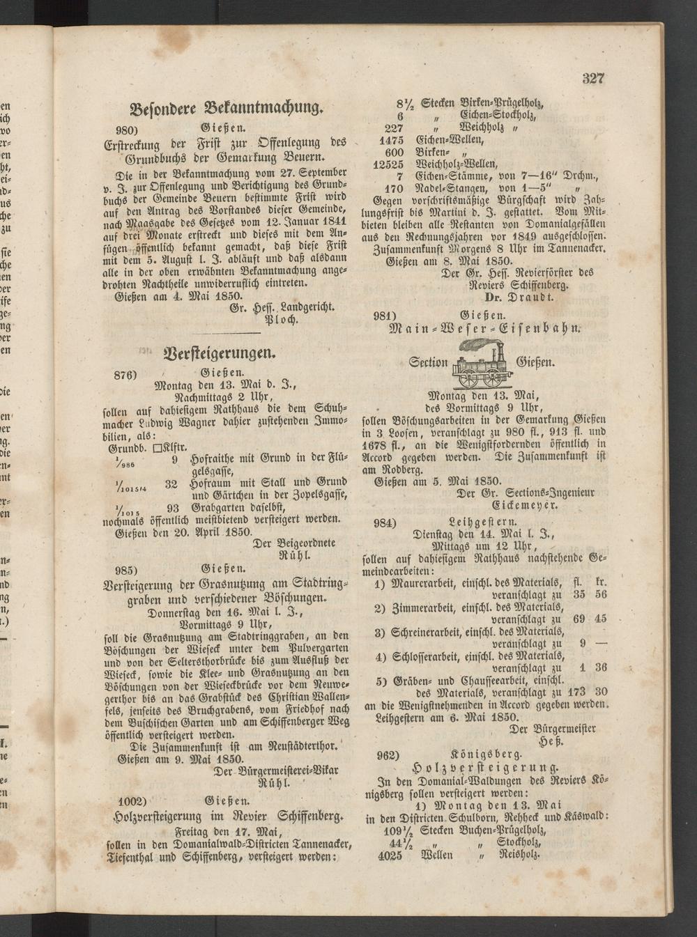 Gegen vorschriftsmäßige Bürgschaft wird Zahlungsfrist bis Martini d. I. gestattet. Vom Mitbieten bleiben alle Restanten von Domanialgefälleir aus den Rechnungsjahren vor 1849 ausgeschlossen. Zusammenkunft Morgens 8 Uhr im Tannenacker. Gießen am 8. Mai 1850.