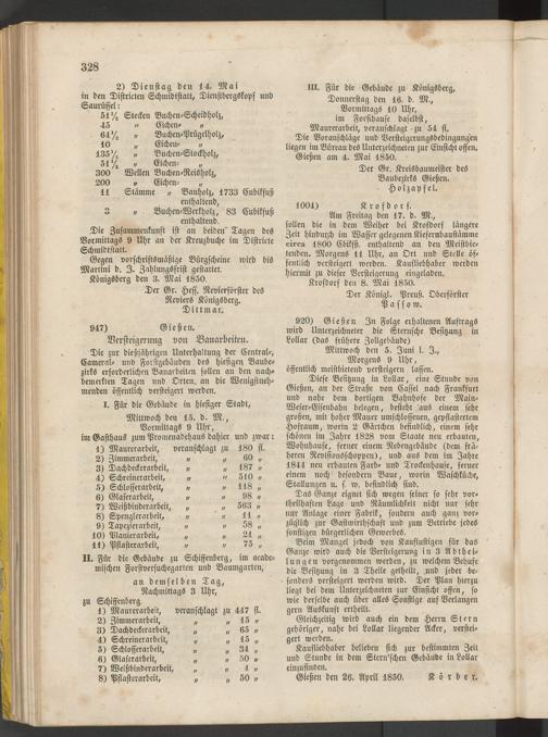 III. Für die Gebäude zu Königsberg. Donnerstag den 16. d. M., Vormittags 10 Uhr, im Forsihause daselbst, Maurerarbeit, veranschlagt -zu 54 fl, Die Voranschläge und Versteigerungsbedingungen liegen im Büreau des Unterzeichneten zur Einsicht offen.