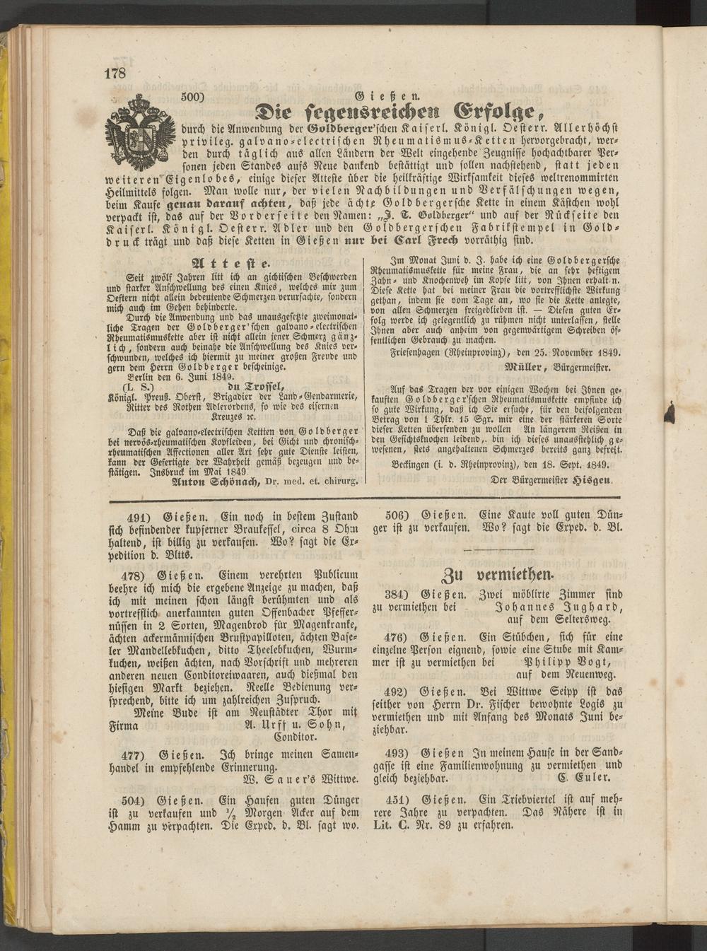 durch die Anwendung der Goldberger'schen Kaiser!. König!. Oesterr. Allerhöchst Privileg, g a l v a n o - e l e c t r i s ch e n Rheumatismus-Ketten hervorgebracht, werden durch täglich aus allen Ländern der Welt eingehende Zeugnisse hochachtbarer Personen jeden Standes aufs Neue dankend bestätligt und sollen nachstehend, statt jeden weiteren'Eigenlobes, einige dieser Atteste über die heilkräftige Wirksamkeit dieses weltrenommirten Heilmittels folgen. Man wolle nur, der vielen Nachbildungen und Verfälschungen wegen, beim Kaufe genau daraus achten, daß jede ächte Gold bergersche Kette in einem Kästchen wohl verpackt ist, das aus der Vorderseite den Namen: „I. D. Goldberger" und aus der Rückseite den Kaiser!. K ö n i g l. O cster r. A dler und den Goldbergerschen Fabrikstempel in Golddruck trägt und daß diese Ketten in Gießen nur bei Carl Frech vorrälhig sind.