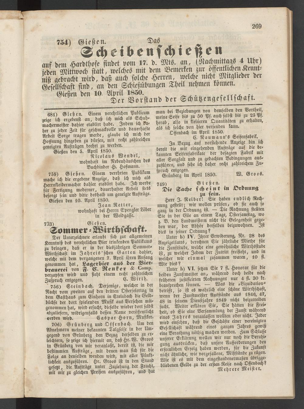 706) Grünberg und Offenbach. Um den Abnehmern meiner bekannten Talgseife in der Umgegend von Grünberg den Bezug derselben zu erleichtern, so zeige ich hiermit an, daß Hr. W. Groos in Grünberg von mir veranlaßt, bereit ist, die mir bestimmten Aufträge, mit denen man sich für die Folge an denselben wenden wird, mit aller Pünktlichkeit auszuführen. Hr. Groos ist in den Stand gesetzt, die Aufträge unter Zuziehung der Fracht, mit mir zu gleichen Preißen auszuführen, und hat