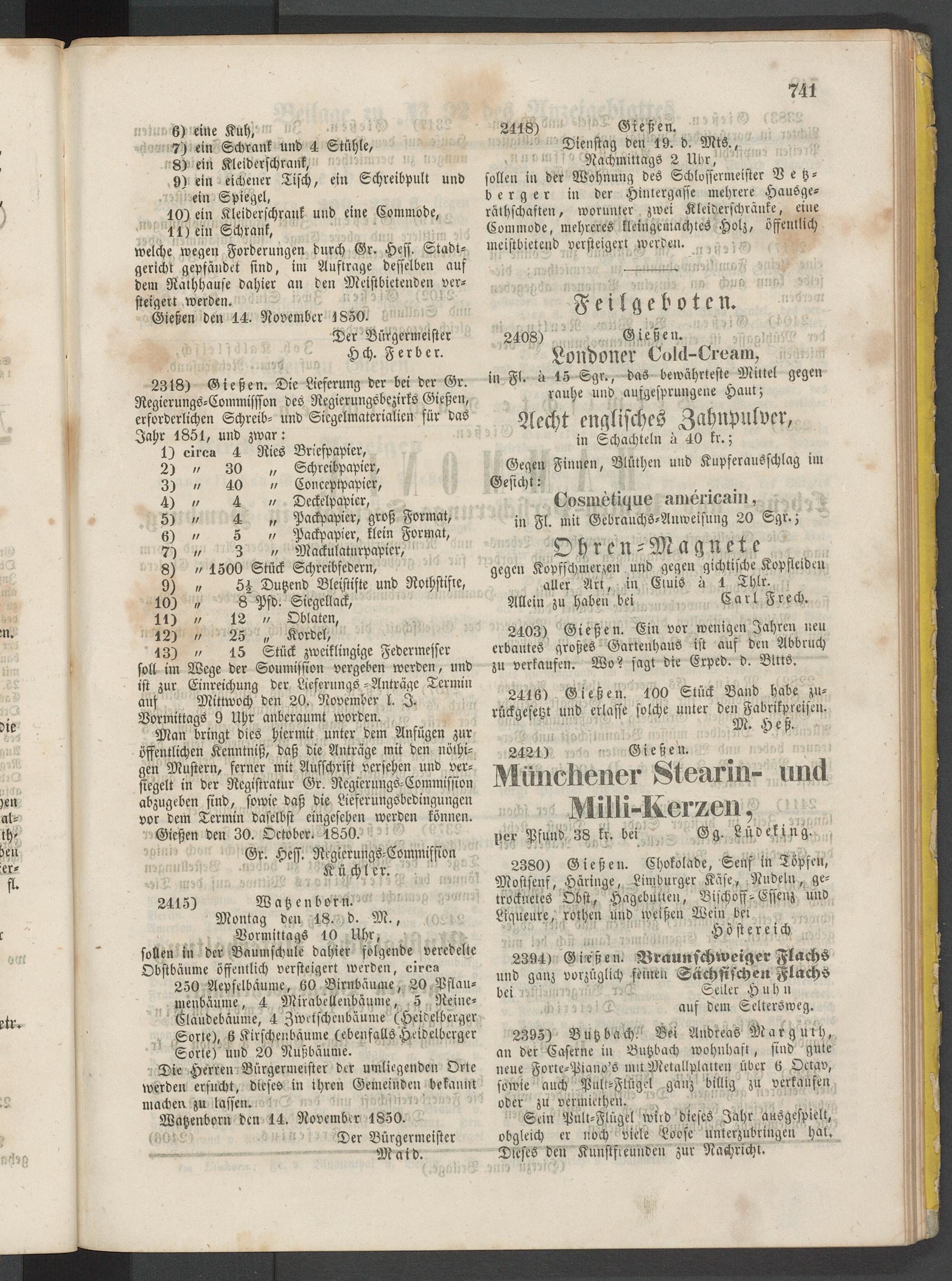 2318) Gießen. Die Lieferung der bei der Gr. Regierungs-Commissson des Regierungsbezirks Gießen, erforderlichen Schreib- und Sicgelmaterialicn für das Jahr 1851, und zwar:
