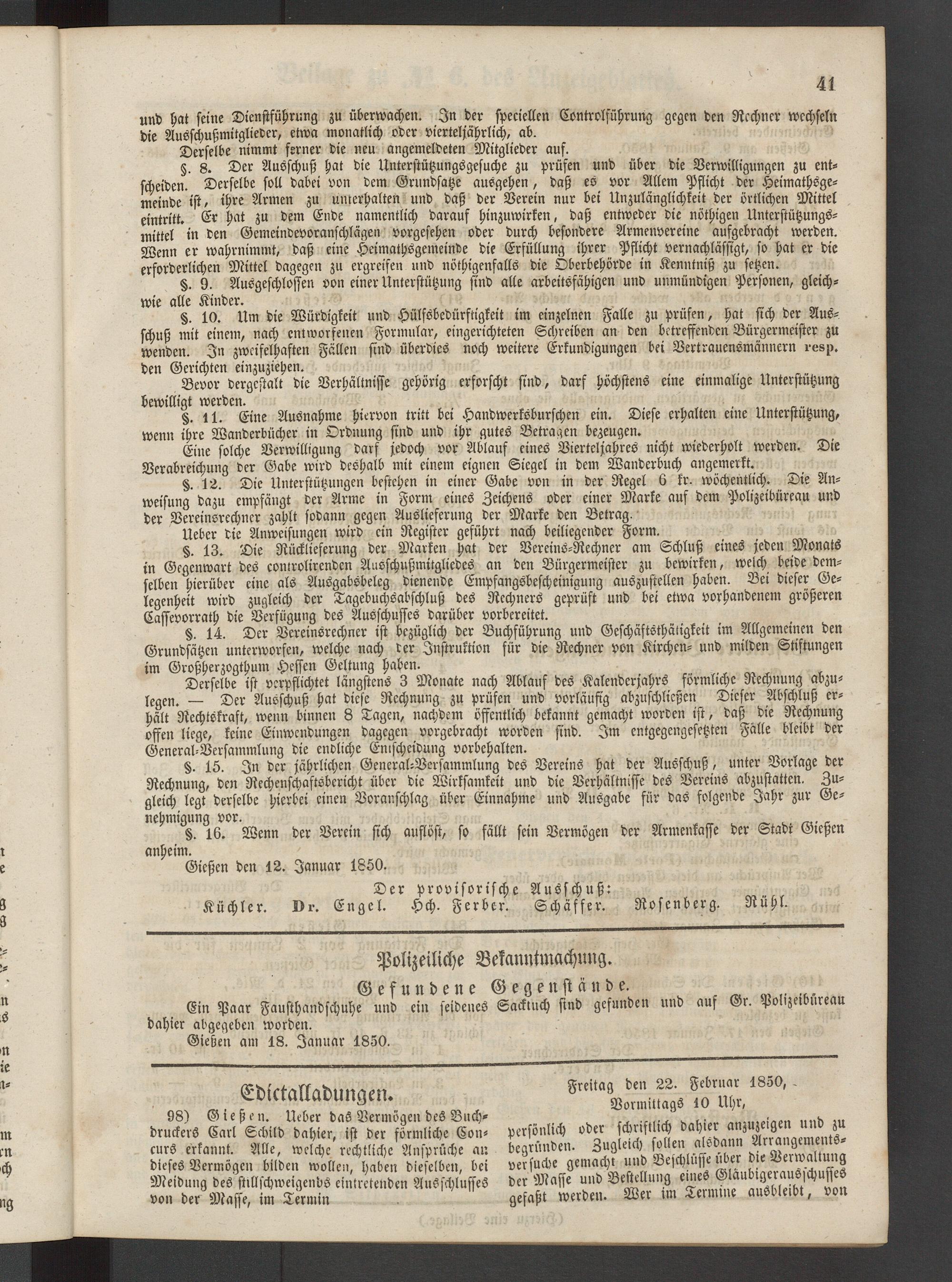 ber Verein sich auflöst, so fällt sein Vermögen der Armenkasse der Stadt Gießen Januar 1850.