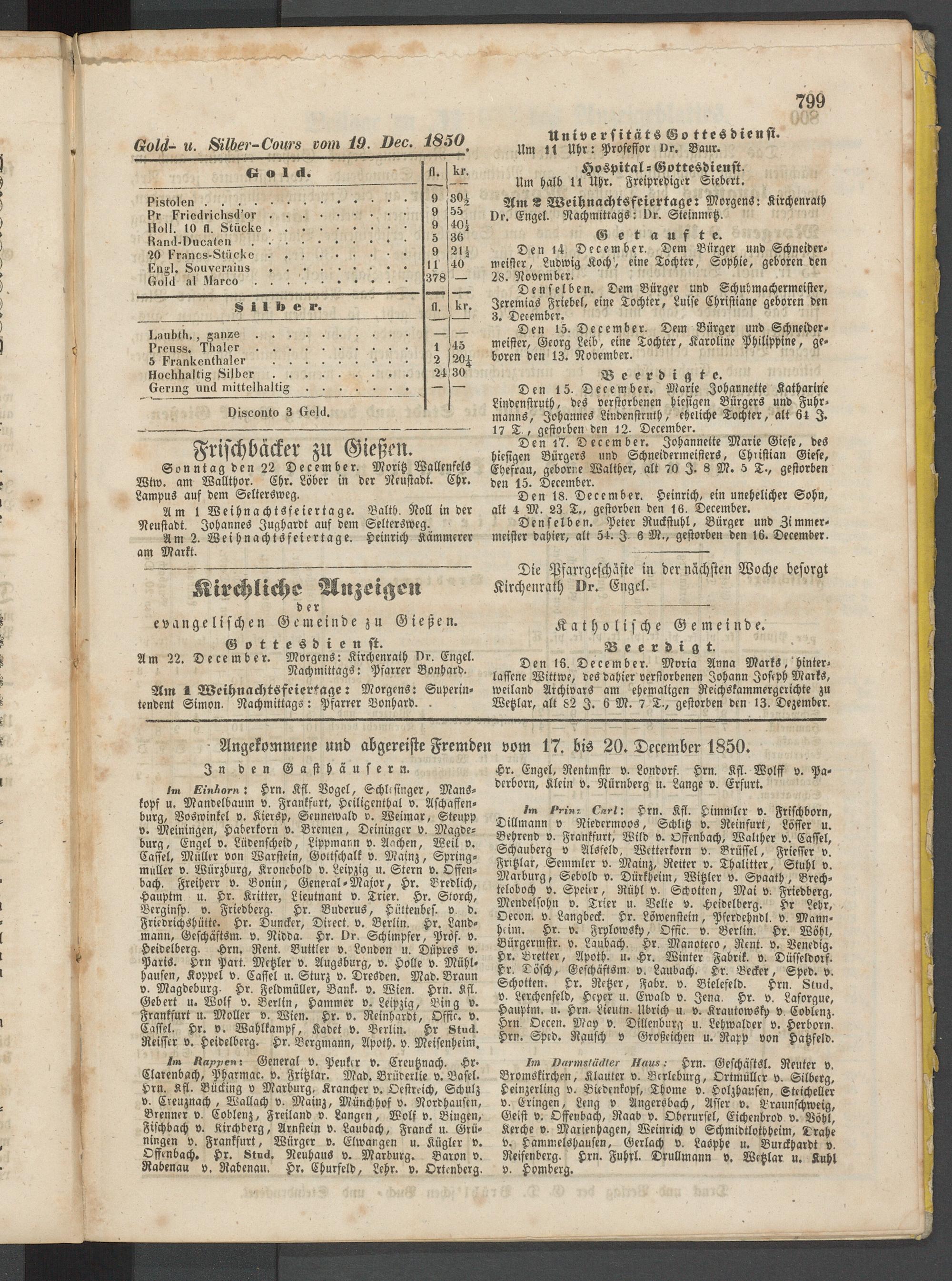 Angekommene und abgereiste Fremden vom 17. bis 20. December 1850.