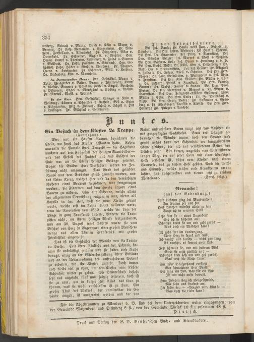 tm Darmstaedter Haus : Hrn Geschäftsl. Wurm Ö. Tor'ol, Weisgerber v. Baiern, Braun v. Winterberg, Kemps v. Alsfeld, Sommer v. Ständen, Henkel v. Echzell, Bertheim v Büdingen, Engel v. Ebersgöns u. Bücking v. Alsfeld. Hr. Morrell, Musik, v. Worms.