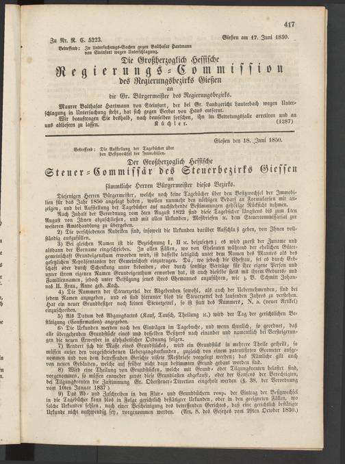 9) Das Ab- und Zuschreiben in den Flur- und Grundbüchern resp. bet Eintrag der Besitzwechsel in die Tagebücher kann blos in Folge gerichtlich bestätigter Urkunden, oder in den geeigneten Fallen, wo solche Urkunden fehlen, nach einer Bescheinigung deS betreffenden Gerichtes, daß eine gerichtlich bestätigte Urkunde nicht nothwendig seh, vorgenommen werden. (Art. 8. des Gesetzes vom 29ten October 1830.)
