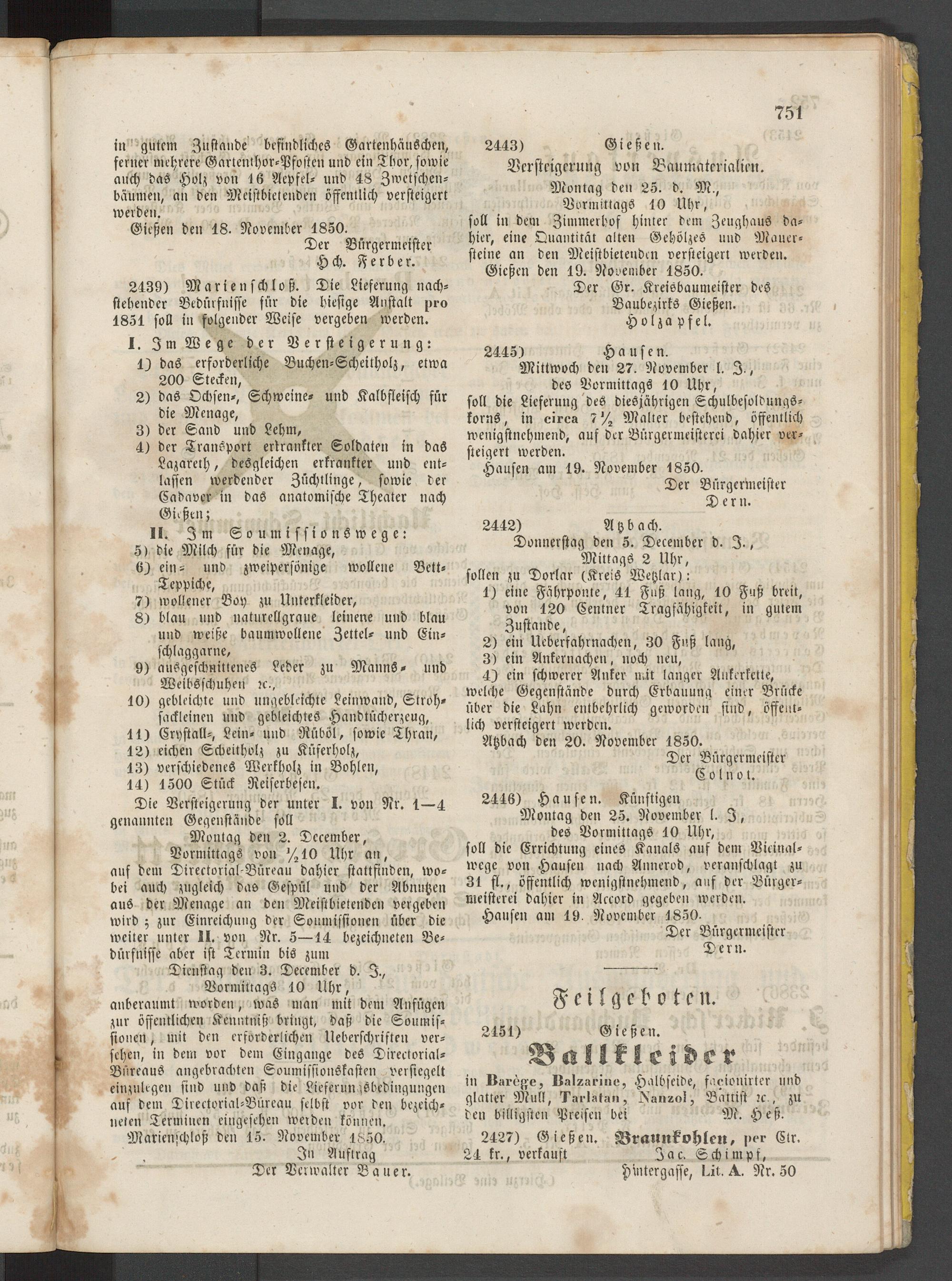 2139) Marienschloß. Die Lieferung nachstehender Bedürfnisse für die hiesige Anstalt pro 1851 soll in folgender Weise vergeben werden.
