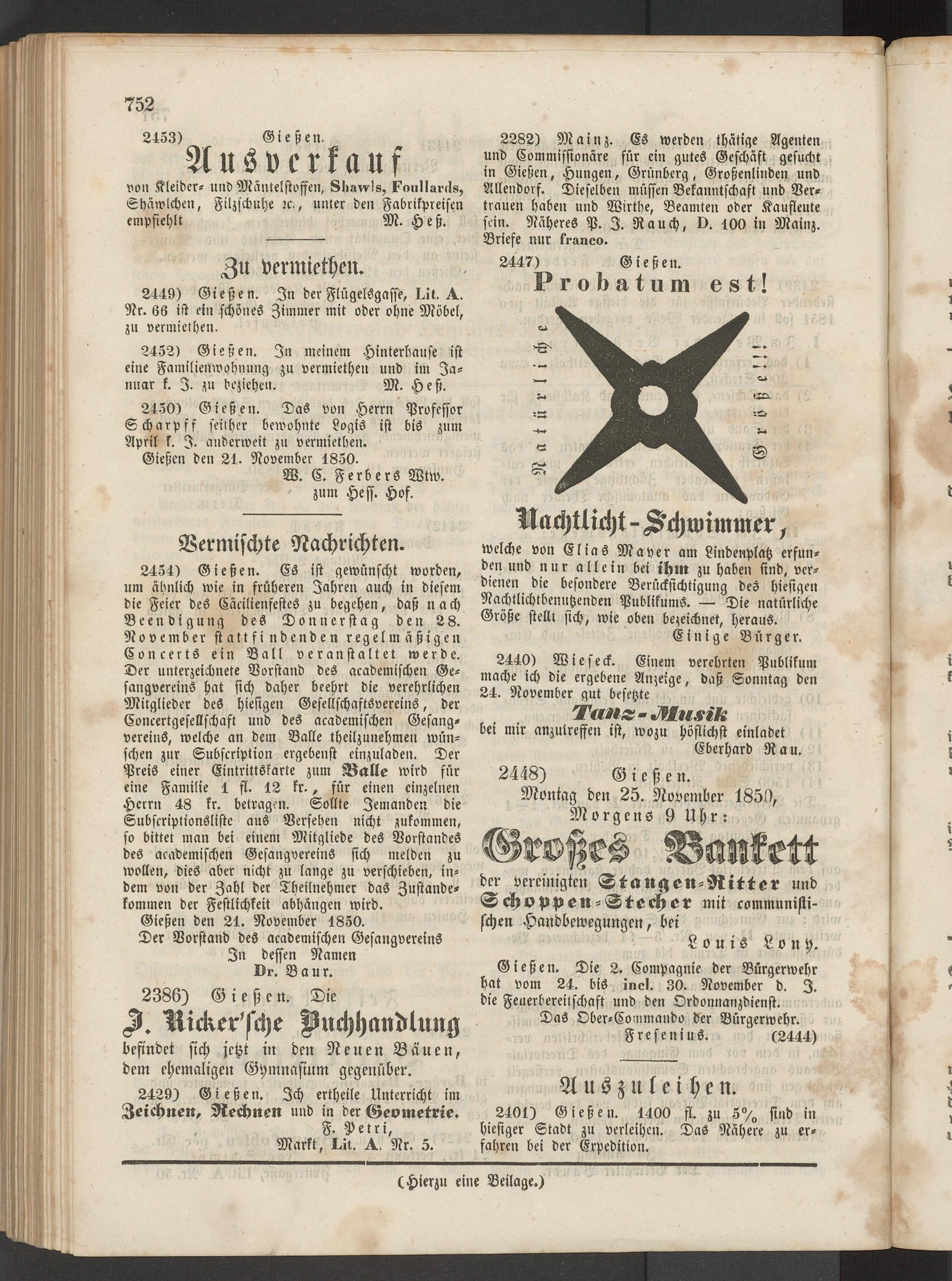 2454) Gießen. Cs ist gewünscht worden, um ähnlich wie in früheren Jahren auch in diesem die Feier des Cäeiliensestes zu begehen, daß nach Beendigung des D o n n e r st a g den 28. November st a tt fi n d en d e n regelmäßigen Cvncerts ein Ball veranstallet werde. Der unterzeichnete Vorstand des academischen Gesangvereins hat sich daher beehrt die verehrlichen Mitglieder des hiesigen Gesellschaftsvereins, der Concertgesellschaft und des academischen Gesangvereins, welche an dem Balle theilzunehmen wünschen zur Subscription crgebenft einzuladen. Der Preis einer Eintrittskarte zum Balle wird für eine Familie 1 fl. 12 fr., für einen einzelnen Herrn 48 fr. betragen. Sollte Jemanden die Subscriptionsliste aus Versehen nicht zukommen, so bittet man bei einem Mitgliede des Vorstandes des academischen Gesangvereins sich melden zu wollen, dies aber nicht zu lange zu verschieben, indem von der Zahl der Theilnehmer das Zustandekommen der Festlichfeit abhängen wird.