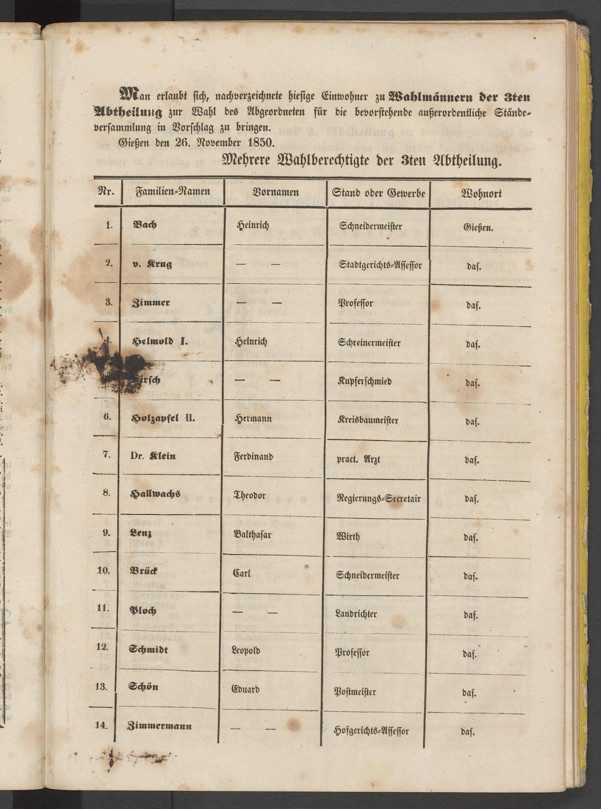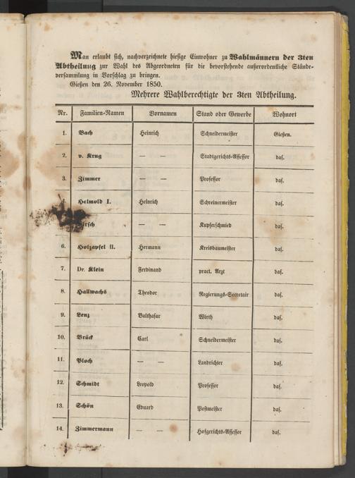Ä^an erlaubt sich, nachverzeichnete hiesige Einwohner zu Wahlmännern der Sten Abtheilmrg zur Wahl des Abgeordneten für die bevorstehende außerordentliche Ständeversammlung in Vorschlag zu bringen.