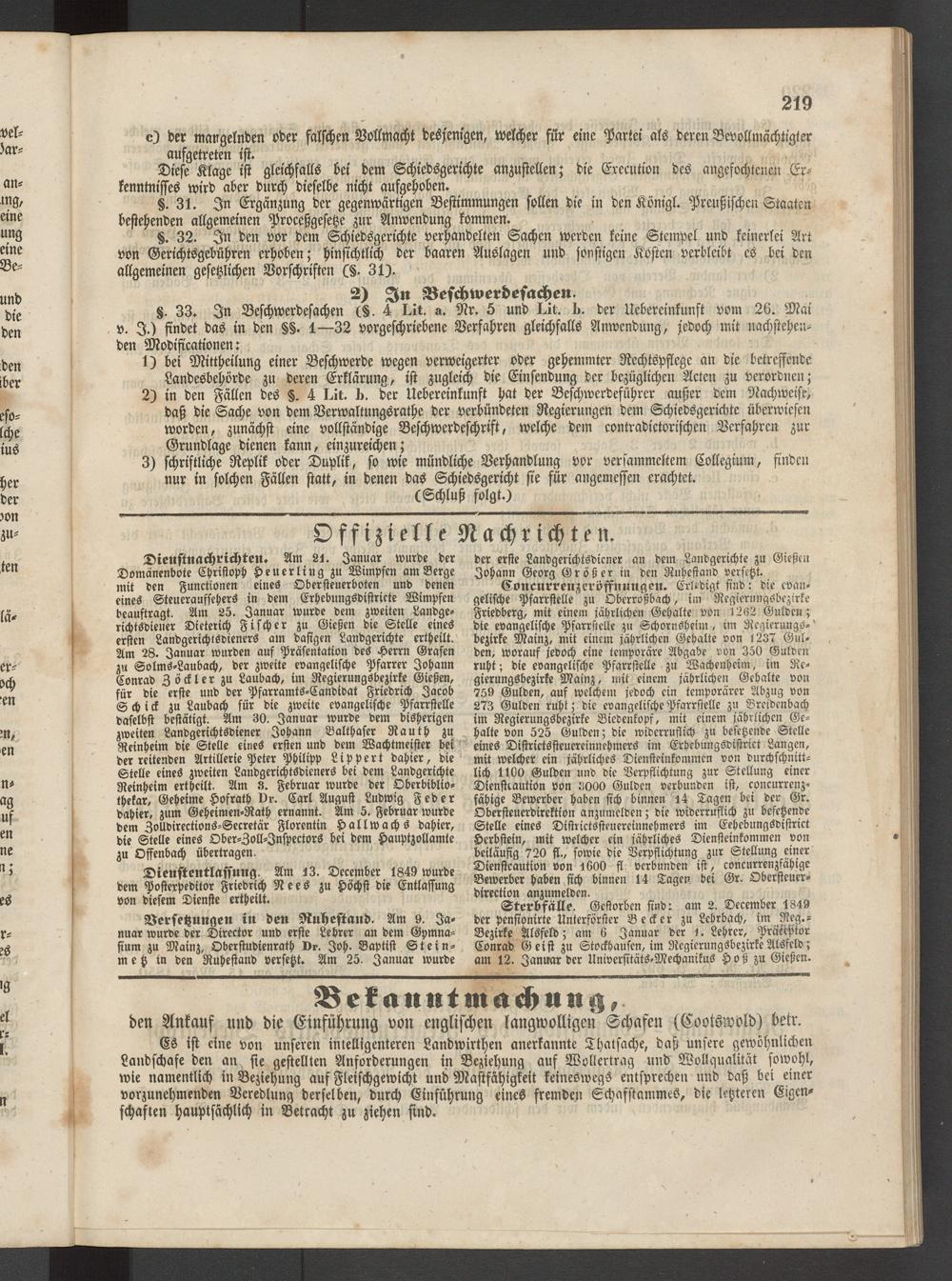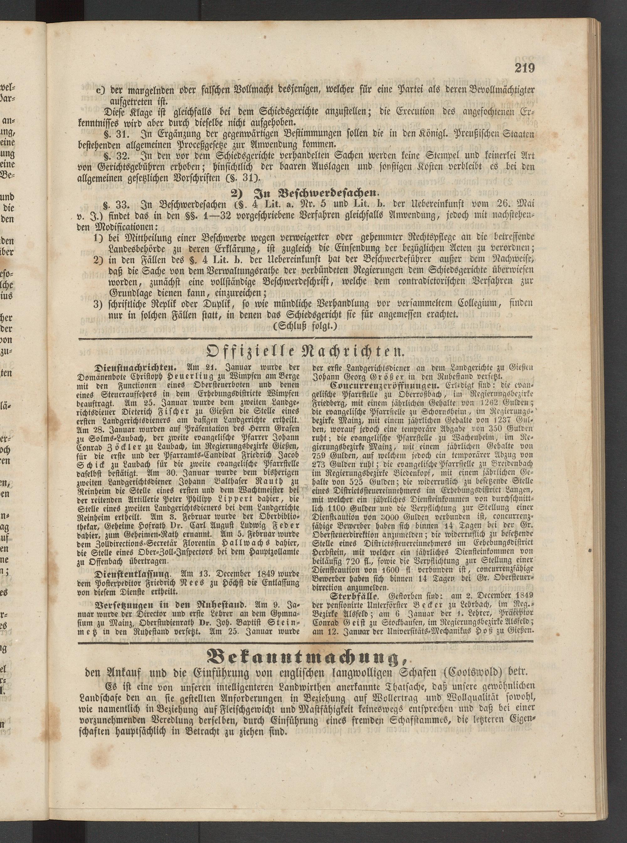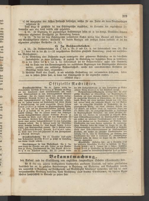 Sterbsälle. Gestorben find: am 2. December 1849 der pensionirte Unterförster Becker zu Lehrbach, im Rcg.- Bezirke Alsfeld; am 6 Januar der 1. Lehrer, PMcptor Conrad 6! eist zu Stockhausen, im Regierungsbezirke Alsfeld; am 12. Januar der Universitäts-Mechanikus Hoß zu Gießen.
