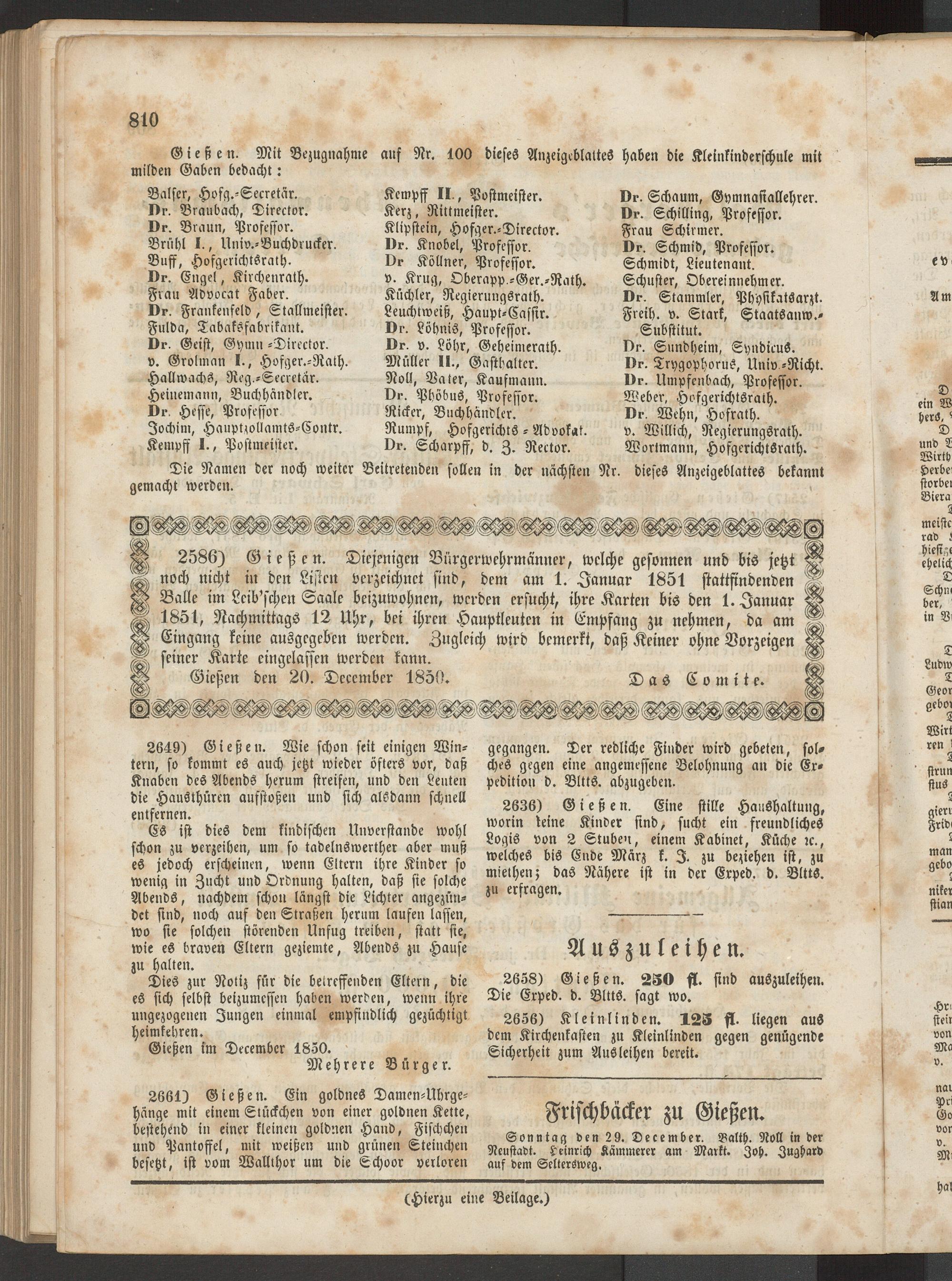 H 2586) Gießen. Diejenigen Vürgerwehrmänner, welche gesonnen und bis jetzt 8 M noch nicht in den Listen verzeichnet sind, dem am 1. Januar 1851 stattfindenden M 5g Balle im Leib'schen Saale beizuwohnen, werden ersucht, ihre Karten bis den 1. Januar W M 1851, Nachmittags 12 Uhr, bei ihren Hauptleuten in Empfang zu nehmen, da am H Eingang keine ausgegeben werden. Zugleich wird bemerkt, daß Keiner ohne Vorzeigen W g seiner Karte eingelassen werden kann. ®